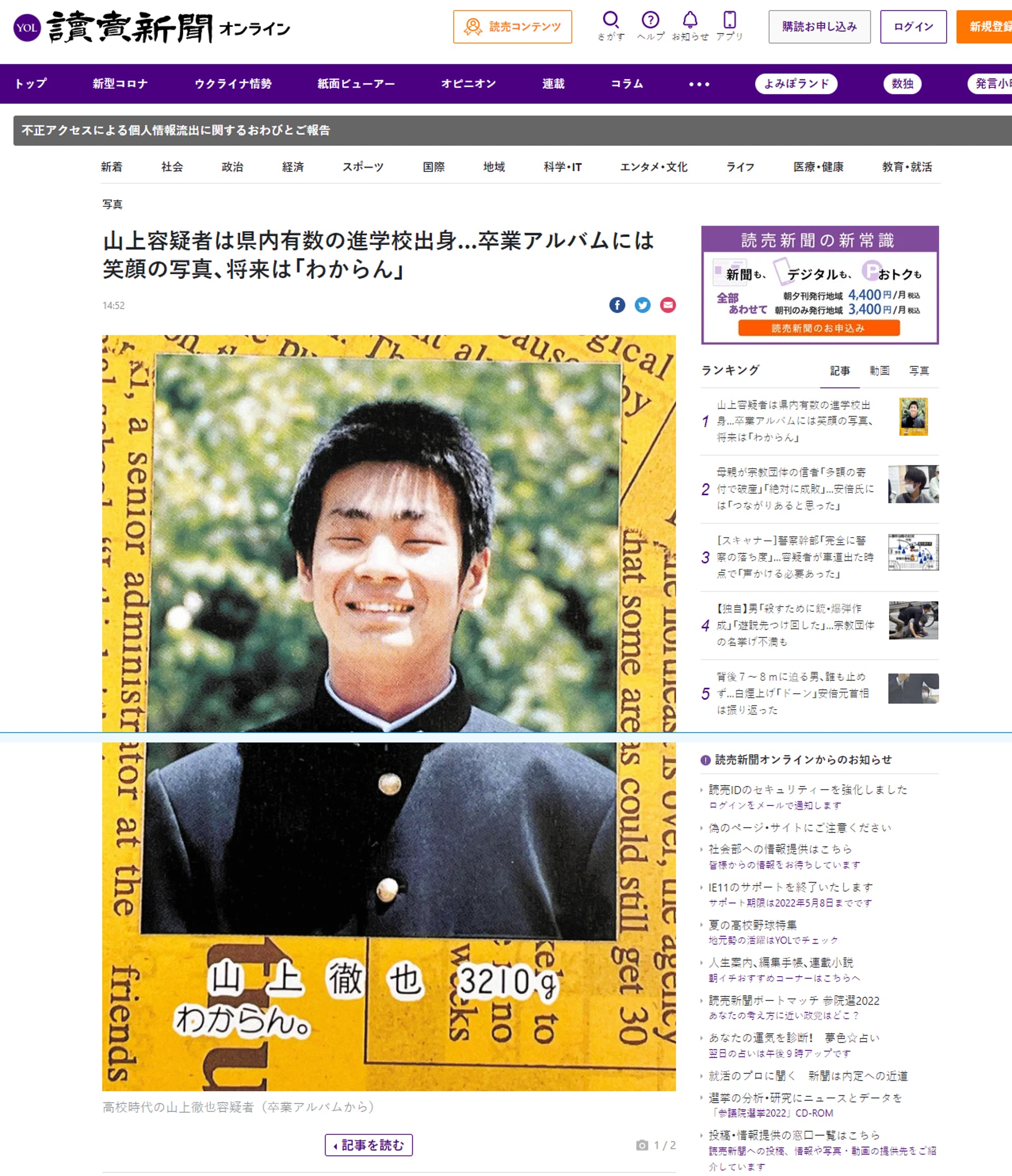 1 Y: P" ~" n) c! W: h4 @公仔箱論壇安倍晉三遇刺:日本《讀賣新聞》披露疑犯山上徹也高中時代的照片,他當時在將來抱負上寫了「不知道」。(yomiuri.co.jp 網站截圖)