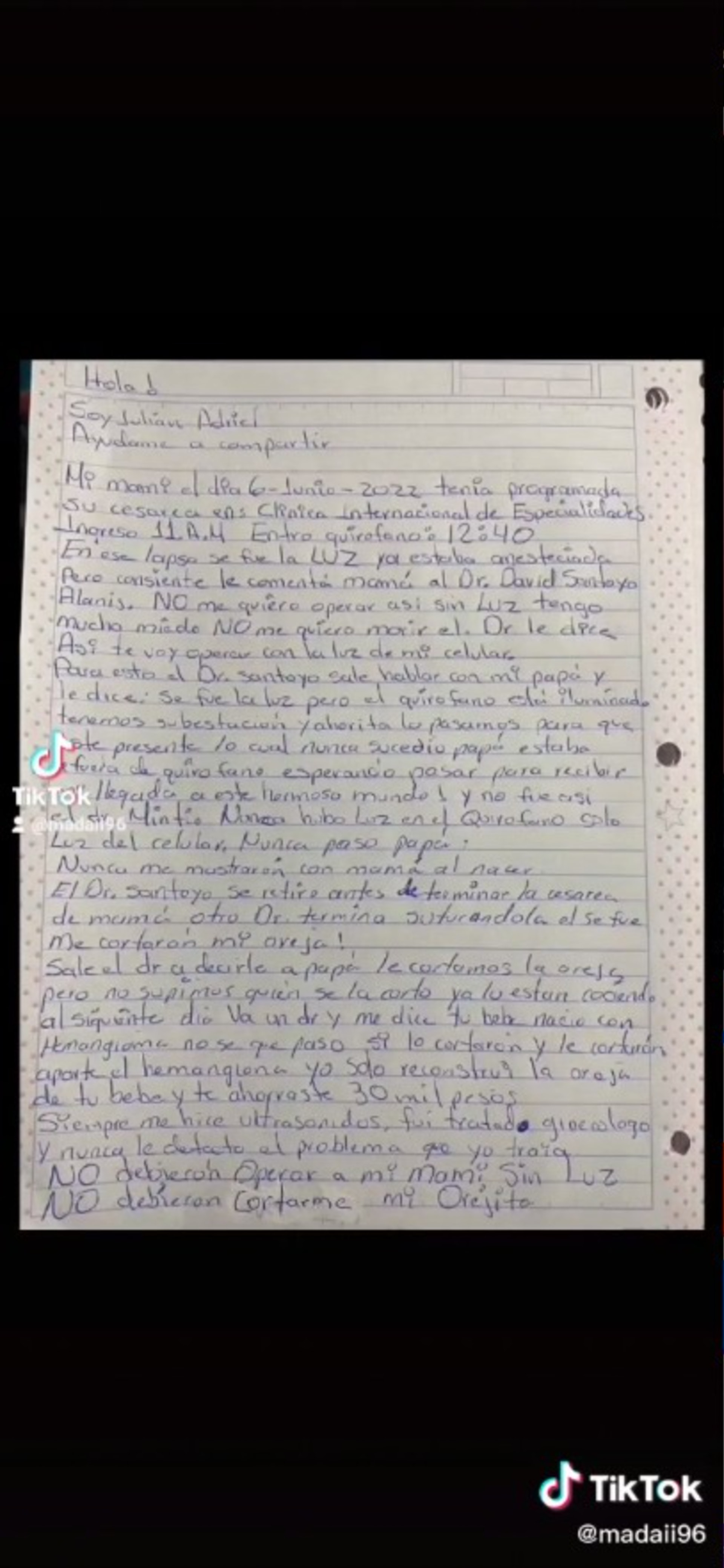 : g+ a) P0 b( S1 U% P# k; ]卡拉說明,6月6日上午11時,她前往下加利福尼亞州(Baja California)當地醫院預定進行剖腹產,最後被拖到12時40分才順利進入手術房,沒想到進去不到10分鐘突然停電,讓她不安向醫生反應延遲做手術,「我不要這樣做手術,沒有光我很害怕,我不想死」,沒想到醫生卻完全不聽,執意繼續開刀,最後在幫嬰兒切除血管瘤時意外割斷左耳。