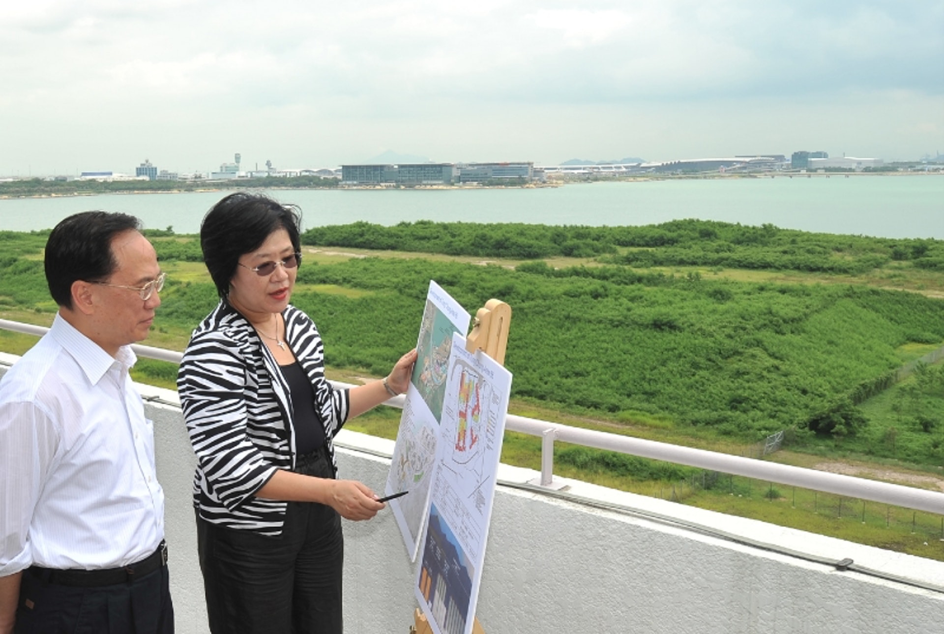 8 w, m: w4 }1 V; Y: p" L) |行政長官曾蔭權2011年7月曾到訪東涌第56區(即迎東邨現址),了解在該處發展住宅的情況。(政府新聞處圖片)