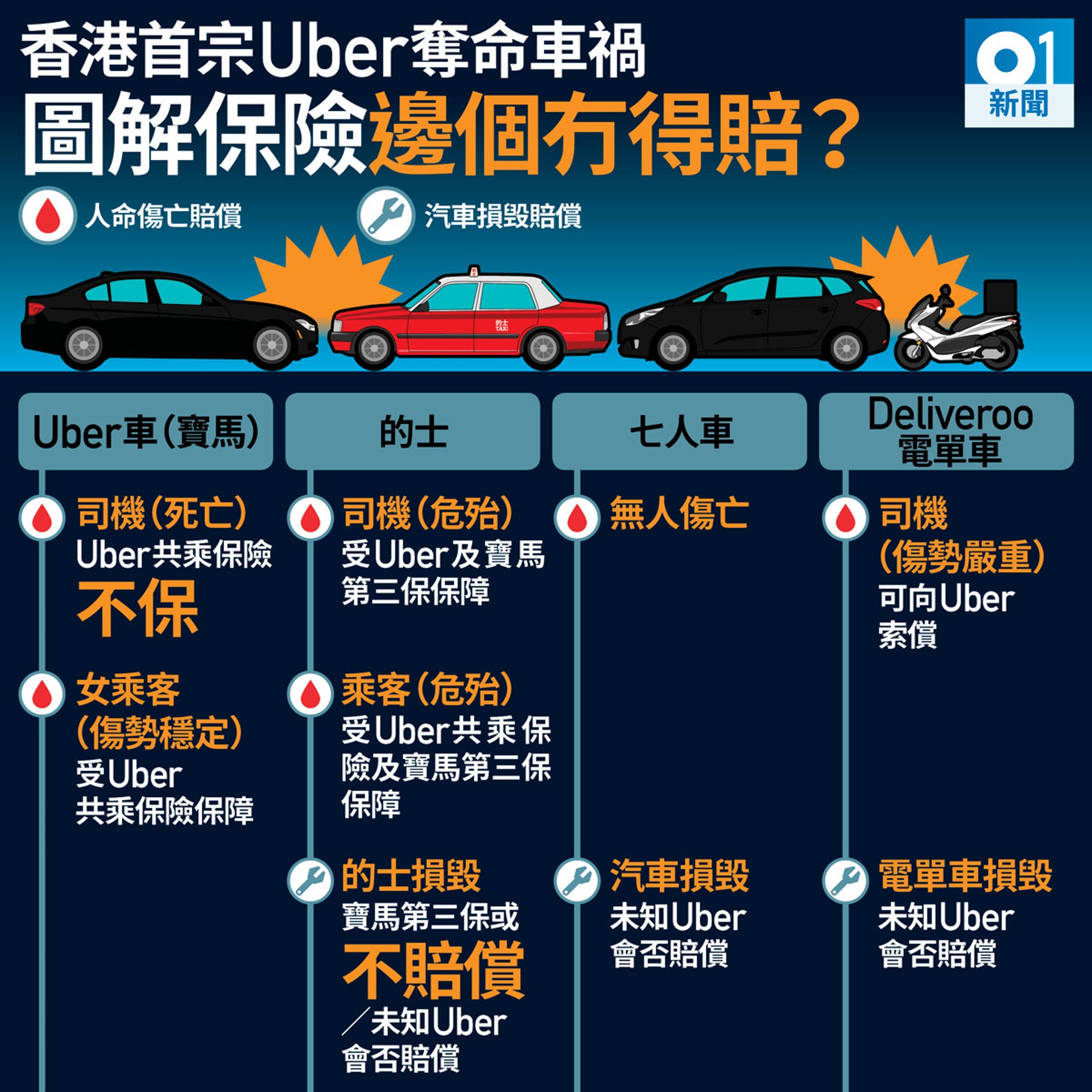 Uber在香港發生首宗奪命車禍,四車相撞釀一死四傷,保險賠償的問題令人關注。被Uber形容是「合作伙伴」、在車禍死亡的寶馬司機,不受Uber「共乘責任保險」保障,但據了解,Uber昨有聯絡家屬商討善後。如只計寶馬私家車車主的第三保,被撞的士可能只獲「賠人不賠車」,或不會對的士損毀作賠償,但未知Uber的保險會否涵蓋。保險業界促請Uber公開保單內容,Uber表示不會再作任何回應。有保險人士指,Uber司機不受Uber保險保障,駕車揾食的風險極大。