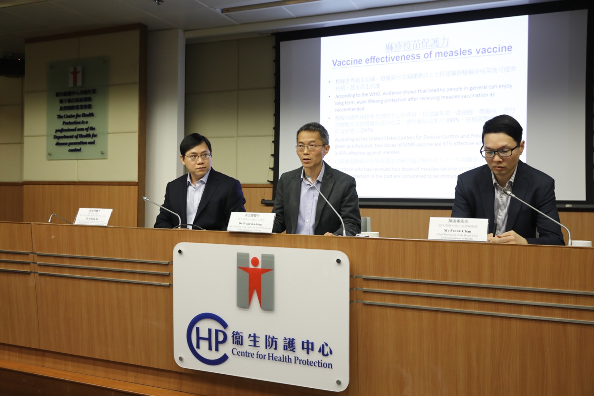 & O5 q# I8 h7 l4 }tvb now,tvbnow,bttvb(左起)衞生署衞生防護中心監測及流行病學處傳染病部首席醫生(監測)歐家榮、衞生防護中心總監黃加慶及衞生署藥物辦公室總藥劑師陳凌峯向傳媒交代麻疹情況。(盧翊銘攝)