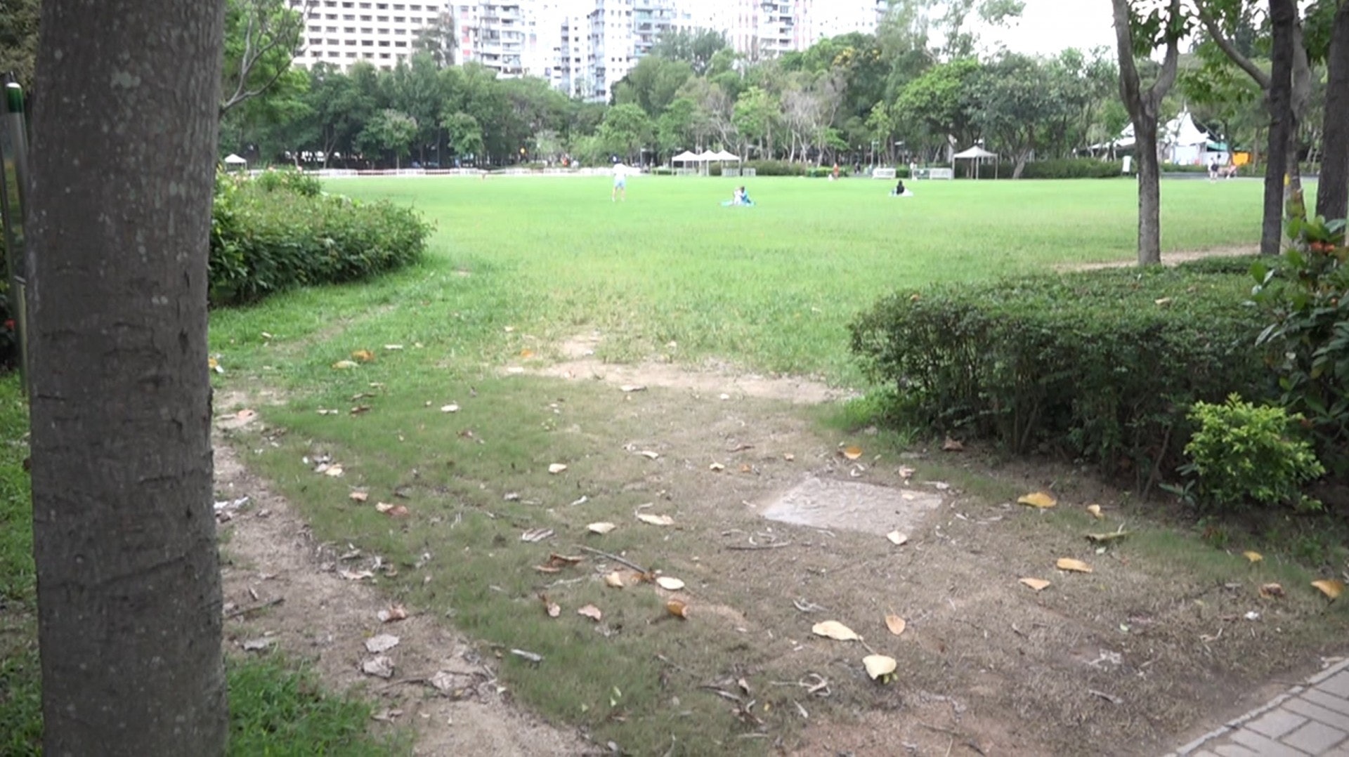 ; x( M% h% r% P5 L5 Z維園中央草坪另一出口同樣狹窄,七一遊行時或造成擠塞。(王海圖攝)