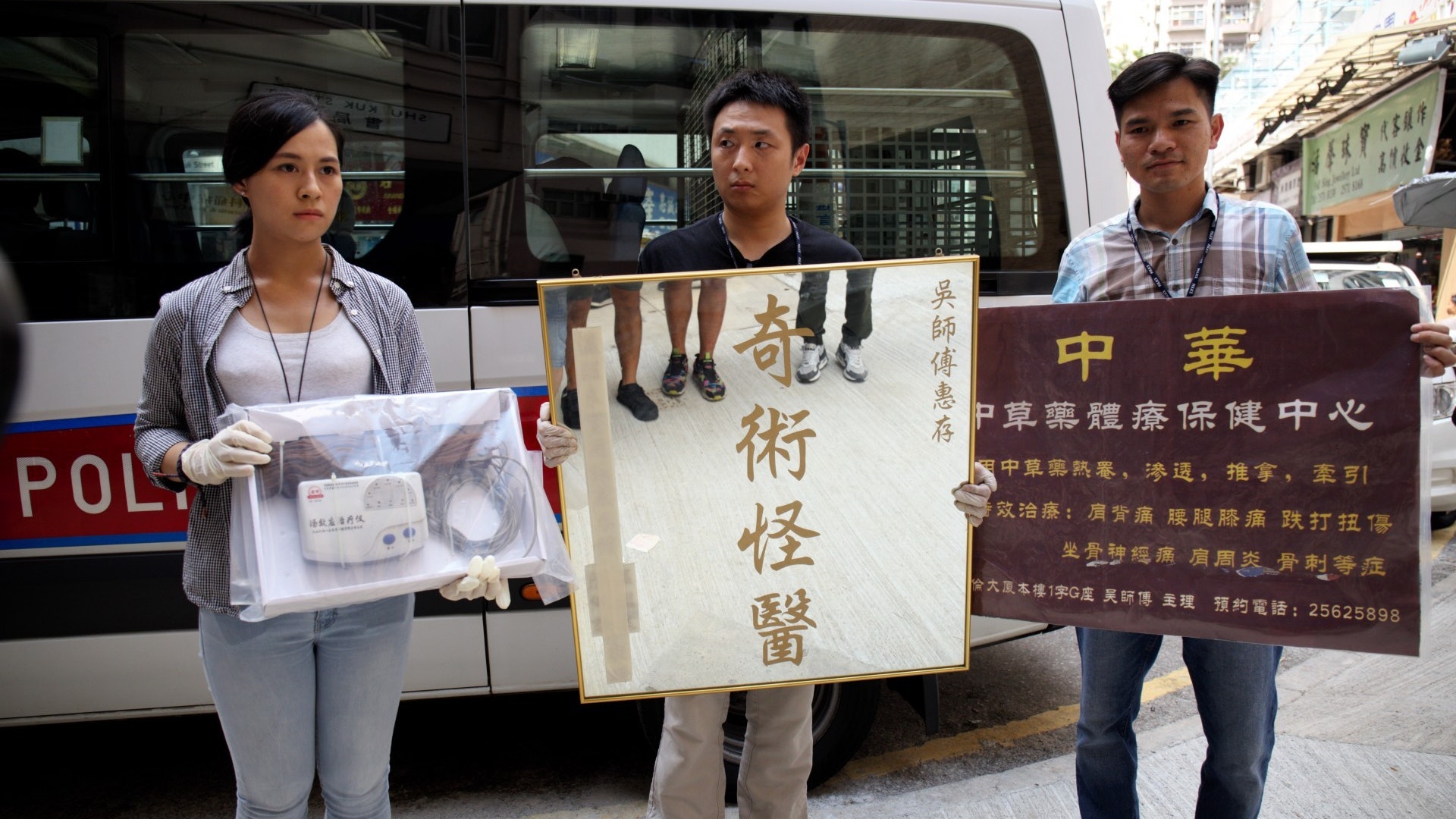 警方搗破一間無牌中醫診所,拘捕一名69歲男子。警方早前接獲線報,懷疑有人於北角書局街23號美輪大廈一單位無牌行醫。今日(27日)早上11時30分,北角分區雜項調查小隊接手調查後,聯同衛生署採取聯合行動,派員喬裝顧客到北角書局街23號一單位求醫,拘捕一名69歲姓吳的中國籍男子,涉嫌「未經註冊作中醫執業」,該名被捕男子現正被扣留調查。行動中人員於現場檢獲一批證物,包括一批中藥、中醫儀器以及一塊寫有「奇術怪醫」的鏡面招牌等等。根據招牌的資料,有關醫館由「吳師傅」主診。2 Y3 B; X }; r% @% C- F2 E