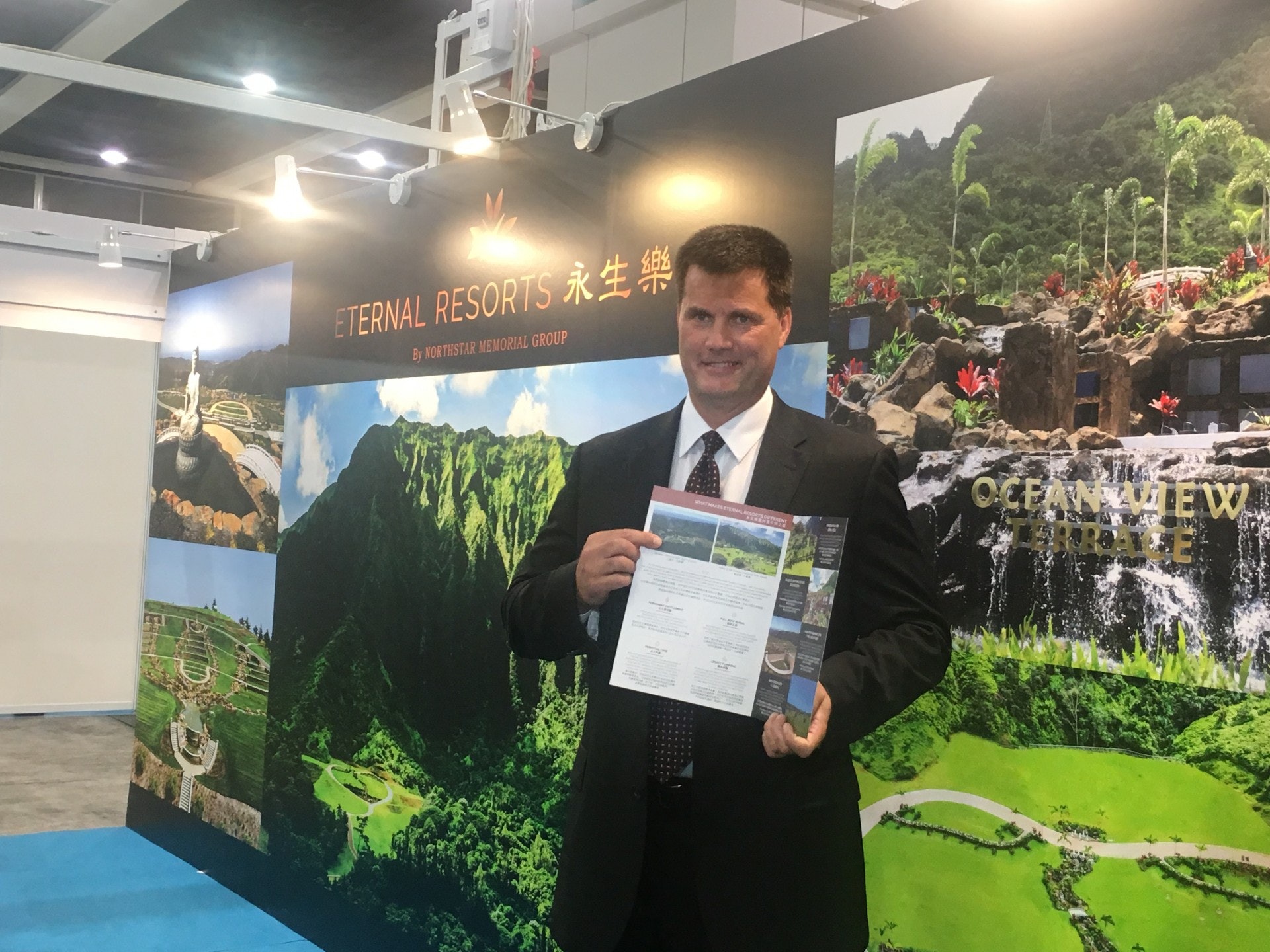 集團首次來港參展,引入海外安葬服務,骨灰龕最低入門費為6千美元,約4萬多港元,土葬墓地則為1.4萬美元,即約10萬港元,並可享有骨灰龕位或土葬用地的永久擁有權及使用權,亦可將其自由轉讓。即使日後墓園結業,先人遺骨亦會受永久保養基金保障,由政府接手管理。 o; t9 d( D2 ~4 P: b