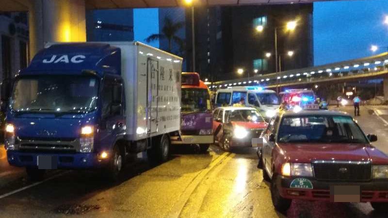 清晨5時許,中環干諾道中往灣仔方向發生4車串燒。(陳永武攝) |