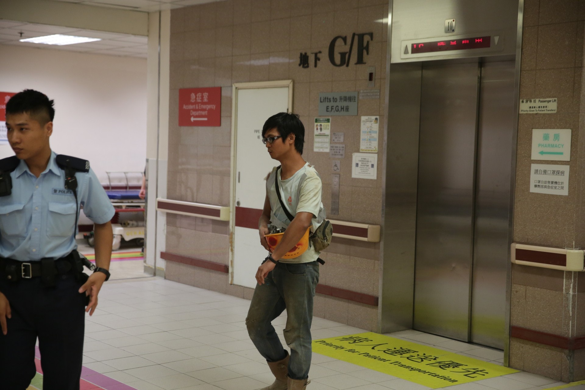 膊頭受傷的工友陪同傷者送院。(黃偉民攝)