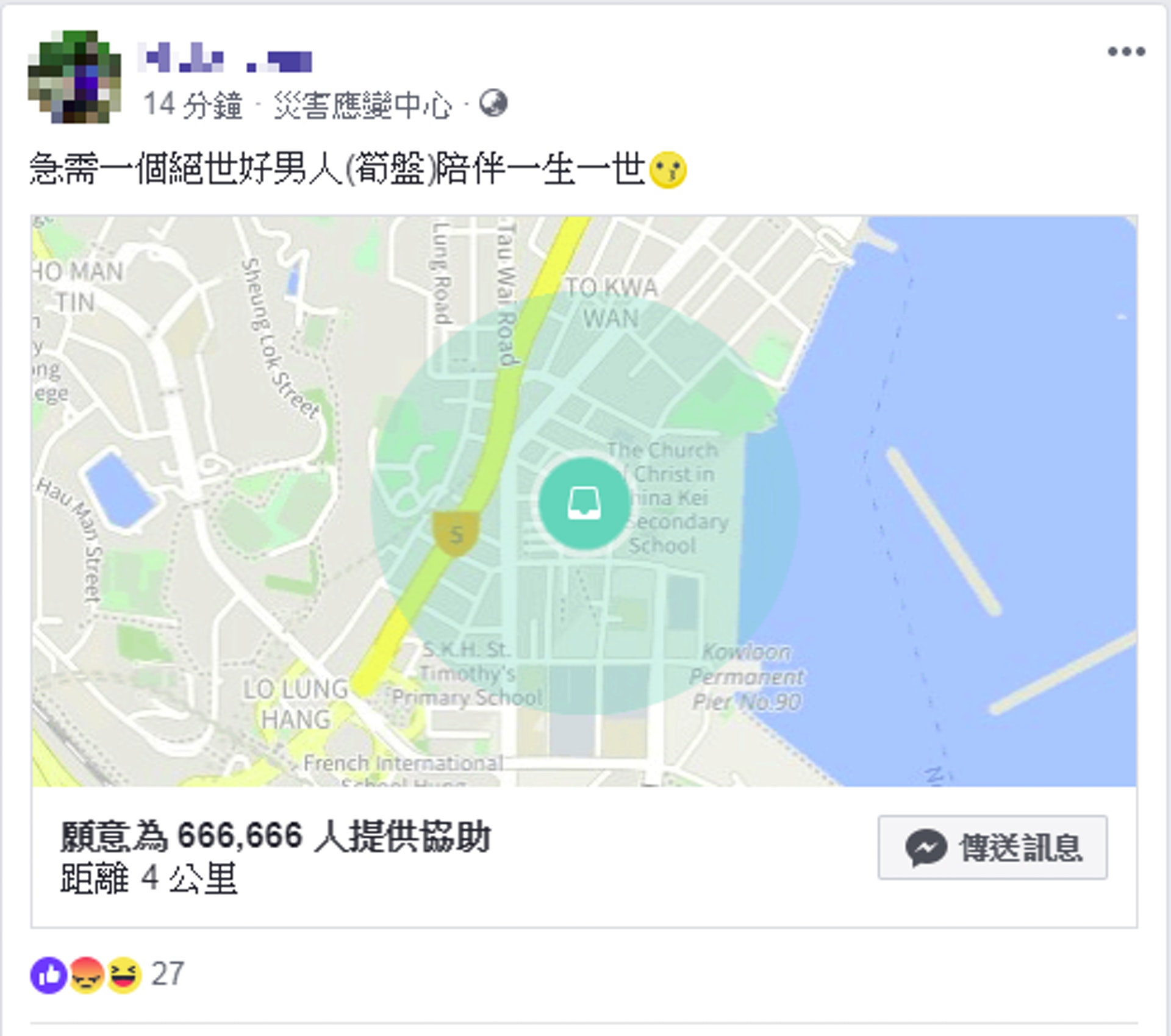在以往巴黎、倫敦恐襲等不同災害中,Facebook報平安功能確實能為災民提供援助,並讓親友得悉其狀況,避免災後市民一窩蜂打電話至受影響區域,無法聯絡親友等問題。但本港卻有濫用求助功能的情況出現,在300多則要求協助的訊息中,不乏開玩笑的內容,包括「急需一個絕世好男人」、「欠條女擋風」等,有可能令真正尋求協助的訊息被埋沒。 |