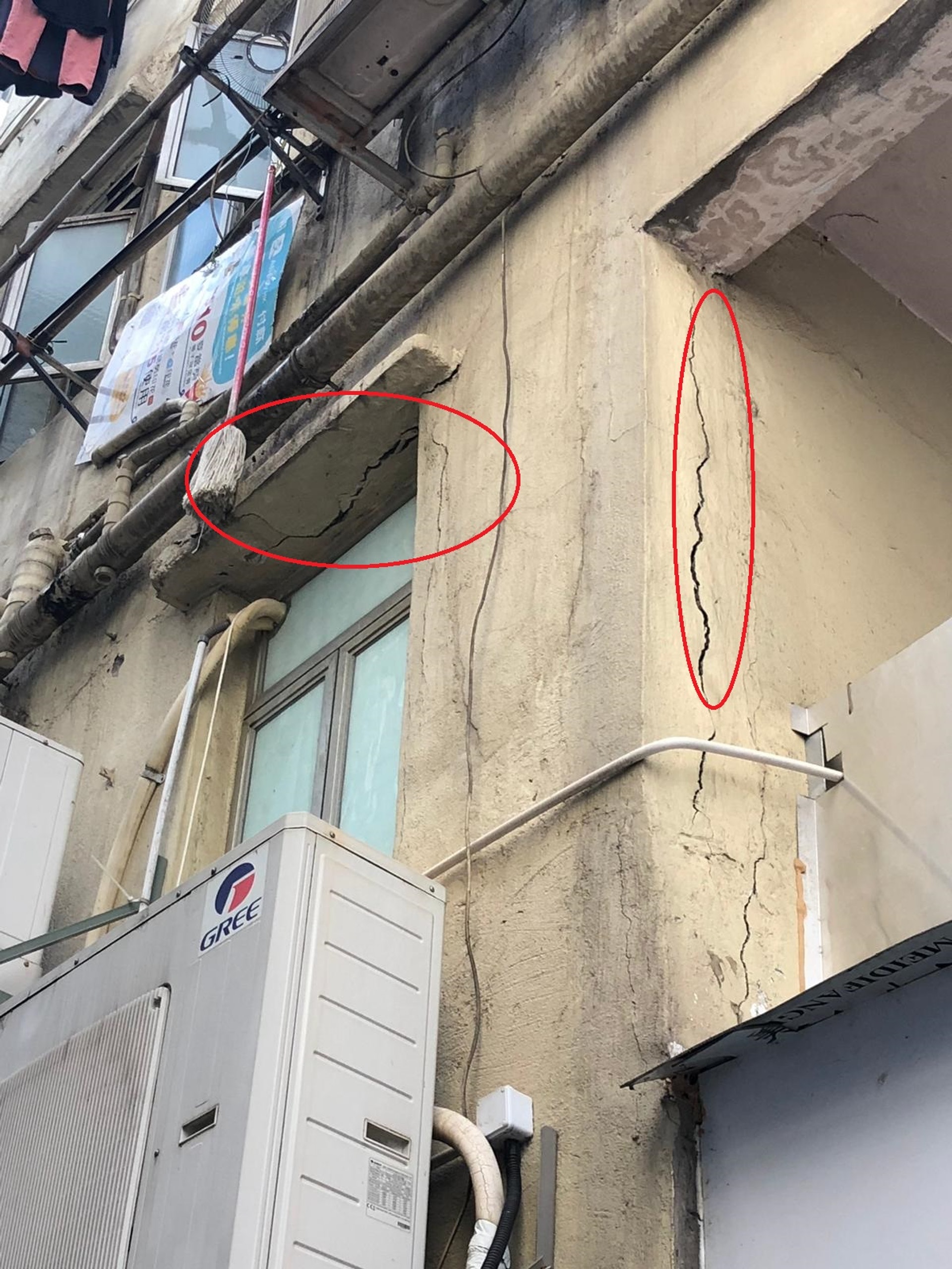 : t1 F- q6 B+ v+ v# V9 Q, M9 }$ x以圖左紅圈所示的簷裂紋,有即時倒塌危機,而右邊紅圈則是主力柱位裂紋。