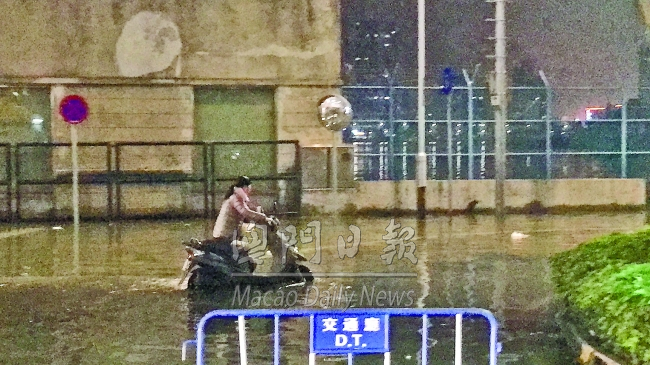 昨晚近十時許,內港近油站附近、河邊新街近碼頭出現海水倒灌,有網友指離島部分地區亦水浸至半輛電單車。受水浸影響,途經車輛濺起水花,途人涉水而行,亦有人急忙“救車”,將被浸的電單車移走。