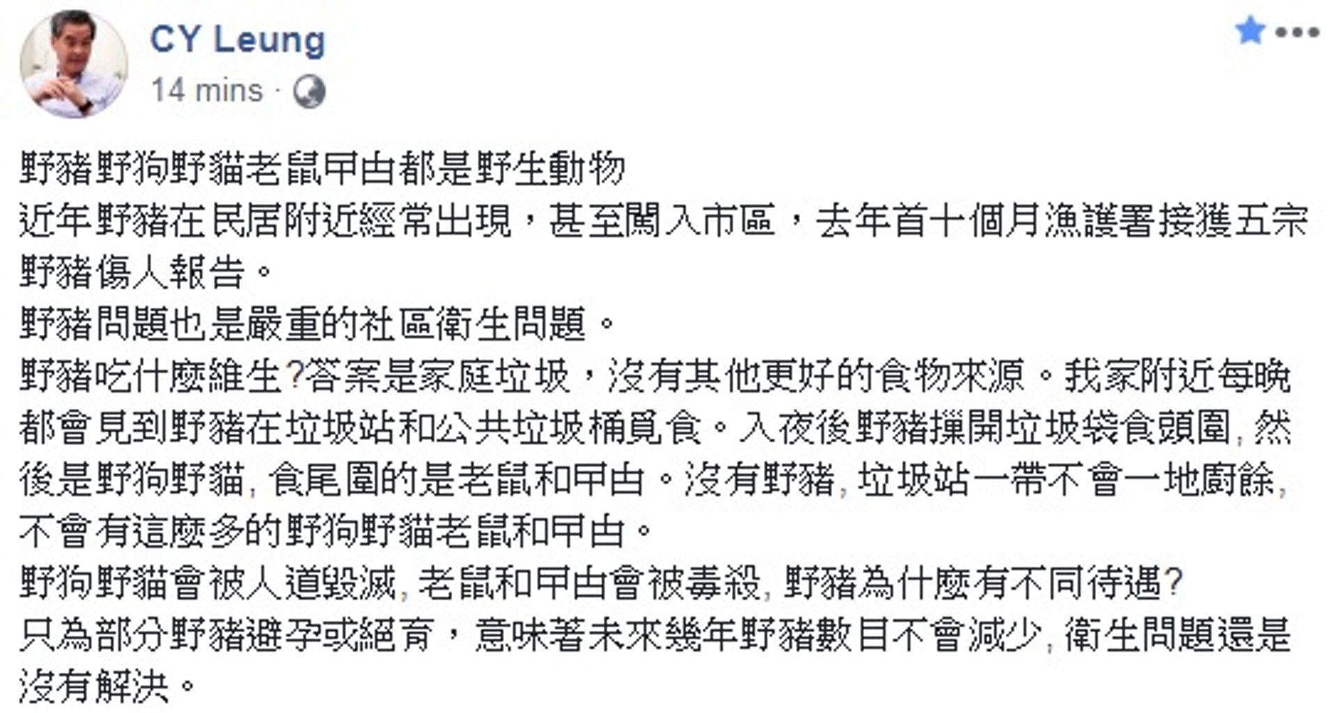 CY今日在facebook發帖,並附上一張拍攝公共垃圾站的照片,可見垃圾散布一地,衛生情況惡劣。之後他再上傳一張不知道是否由他拍攝,野豬在垃圾桶尋食的照片。梁振英首先指出「野豬野狗野貓老鼠曱甴都是野生動物」,而野豬問題亦是嚴重的社區衛生問題,認為沒有野豬,垃圾站一帶就不會有廚餘,就不會有那麼多的野狗野貓老鼠和曱甴。: W; b4 c" i+ N5 {3 k