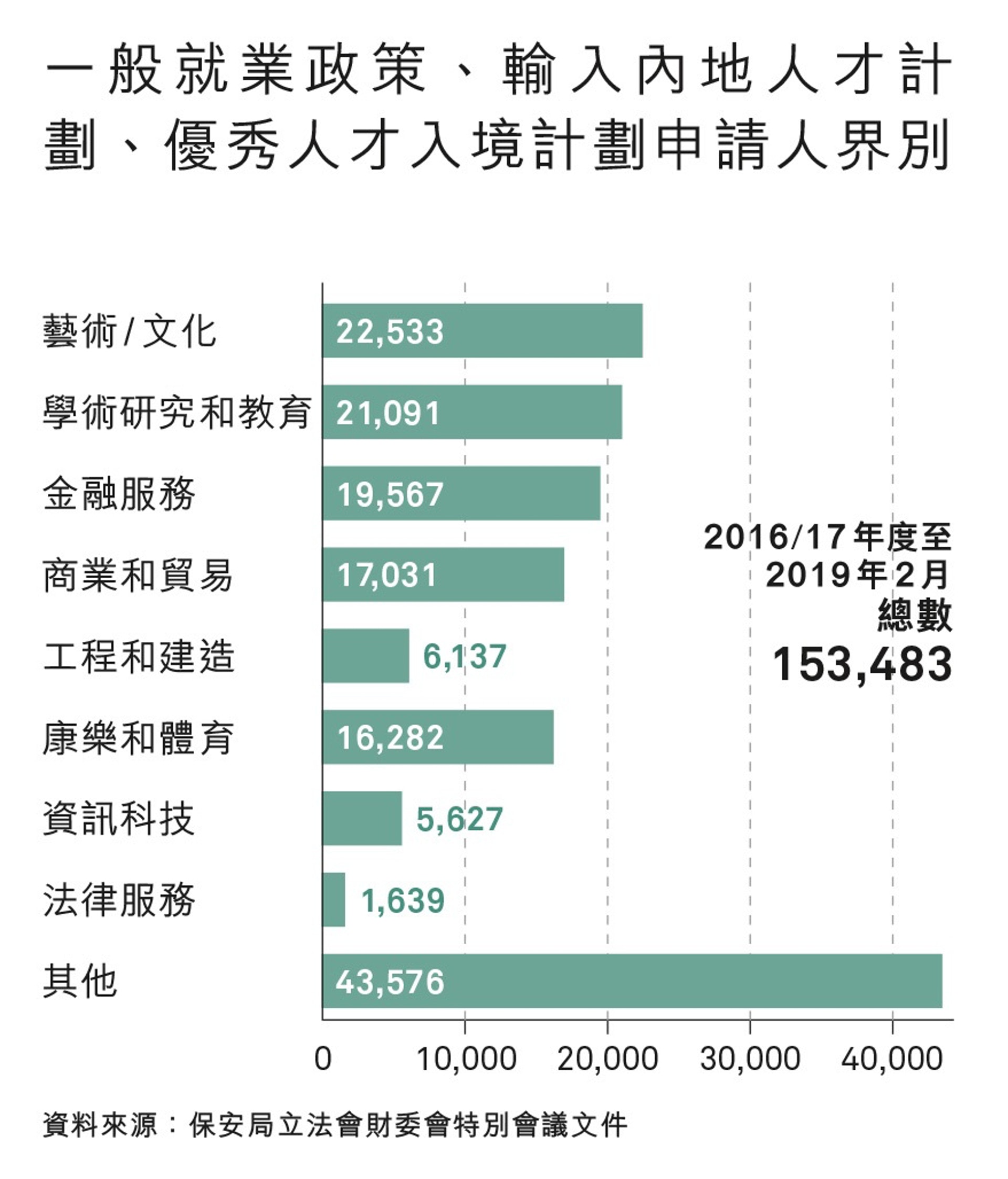 7 |* {- x& T! x+ t: U公仔箱論壇若按行業或界別分類,於2016/17年度至2019年2月底間循「一般就業政策」、「輸入內地人才計劃」及「優秀人才入境計劃」獲准來港的人才中(見下圖),最多為藝術文化界人士,有22,533人(14.7%),其次為學術研究和教育人士(13.7%)及金融服務(12.7%)。惟循首兩項計劃來港工作的人士,逾半申請者不足一年便離港。os.tvboxnow.com8 k- l7 Z6 Q% U" G2 [