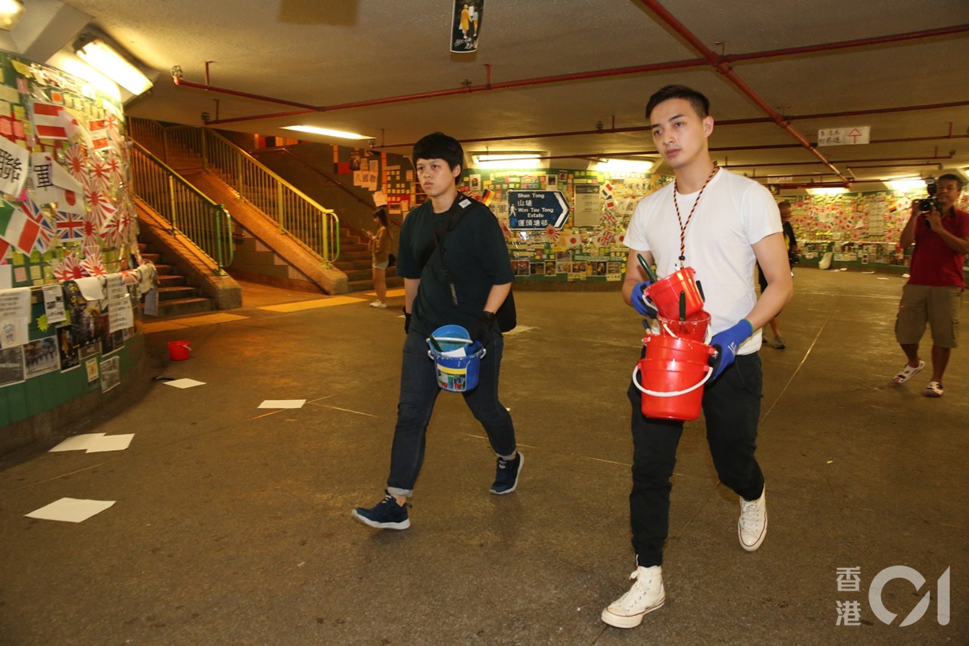隧道被貼上多張「旗幟」,地下遺有裝膠水的橙色膠桶。(Tai Po 大埔 fb)