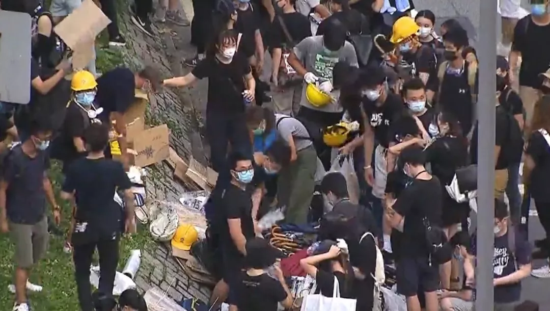 % E, v) U; a1 k9 E. O2 k2 j4 z公仔箱論壇一批穿黑衣青年在上水廣場對開分發物資,包括頭盔、雨遮及口罩,顯然有備而來。現場有部分外籍指揮者