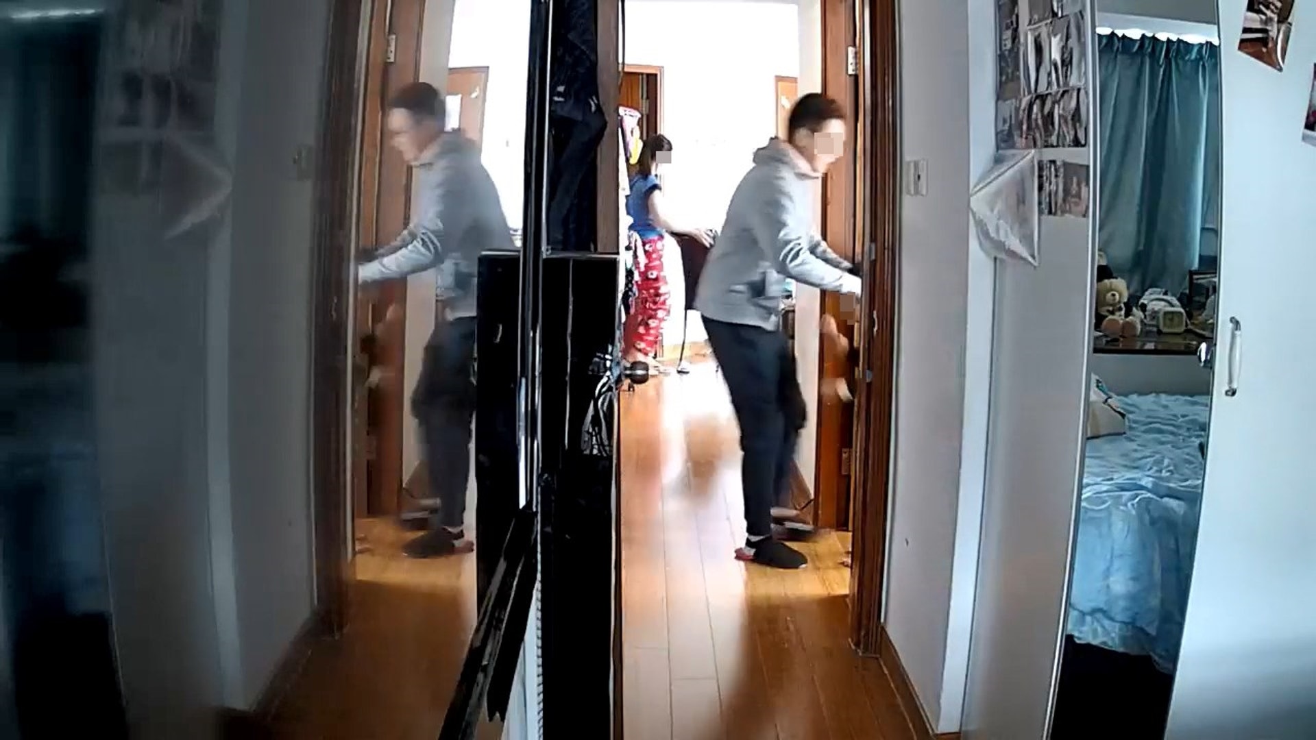 【警員涉虐兒】男子於睡房門前突然雙手捉住兒子頭部搖晃。(網上片段)
