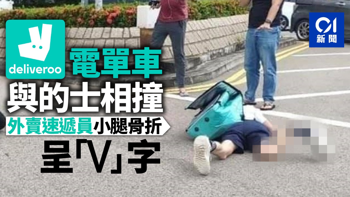 T* U P( T, i8 c% e \/ q# D; l( S2 G大角咀連翔道與海暉道迴旋處有Deliveroo外賣電單車與的士相撞,外送速遞員倒地,右小腿嚴重骨折。(facebook群組「(香港)送餐/送貨員意見交流區」圖片)公仔箱論壇4 [1 I" h) R8 L C. Z4 Q0 }: x" k