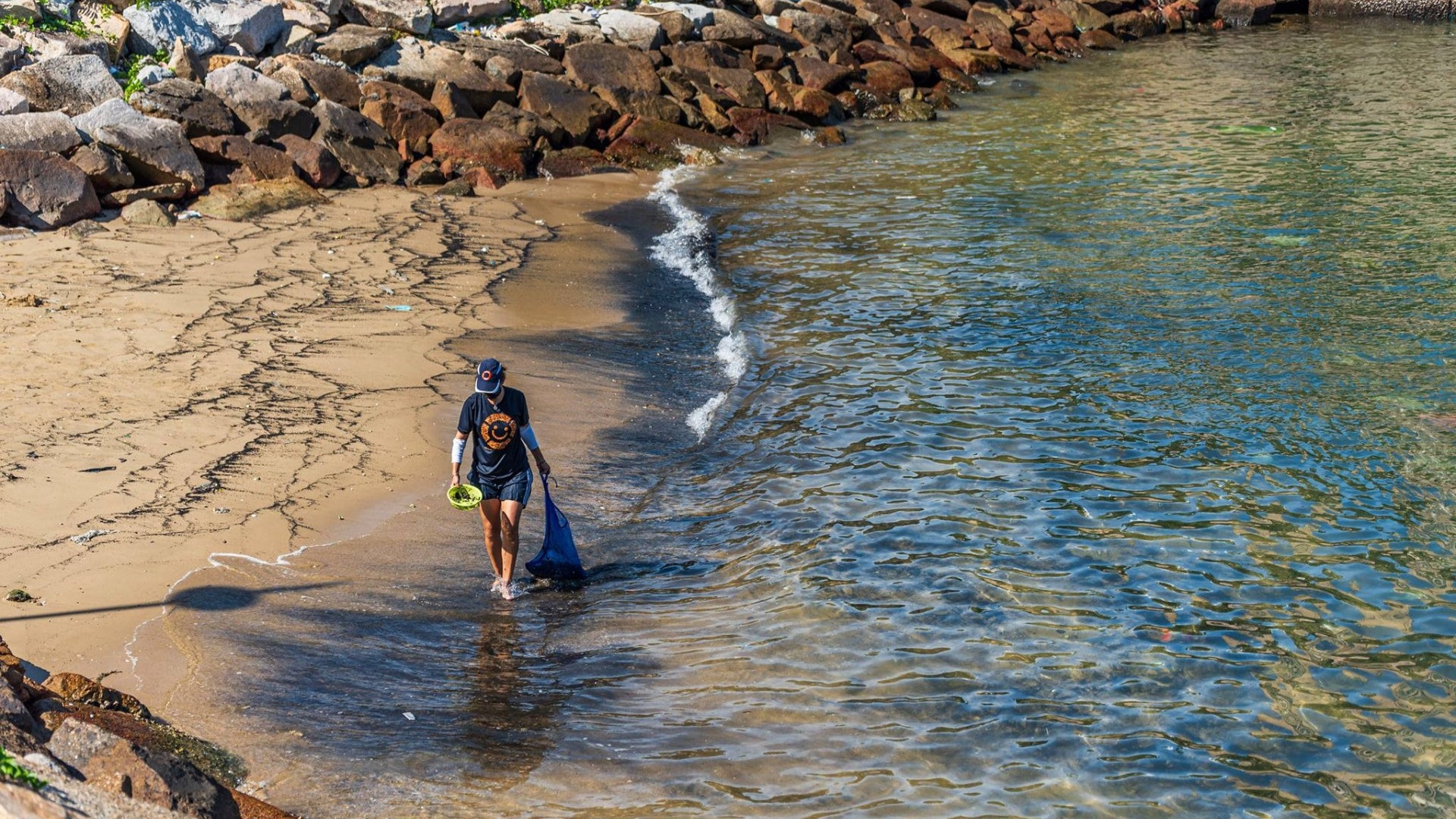 ' h. V; u) p+ V( itvb now,tvbnow,bttvb環團上月尾於愉景灣二白灣,於海面、海床發現大量黑色塑膠粒。(無塑海洋Facebook專頁截圖)