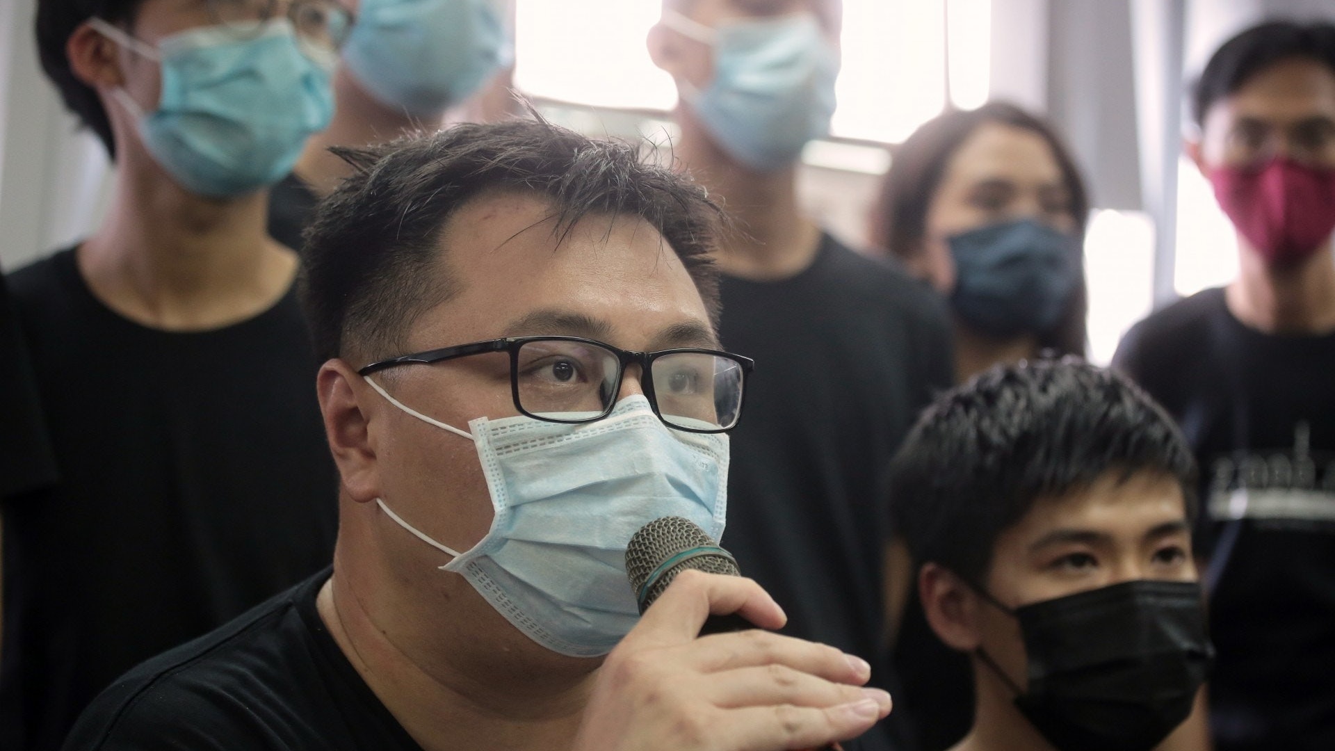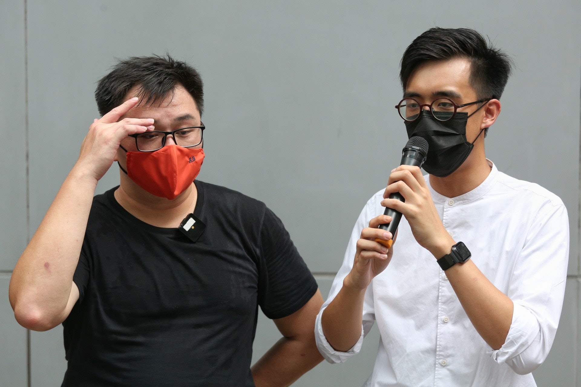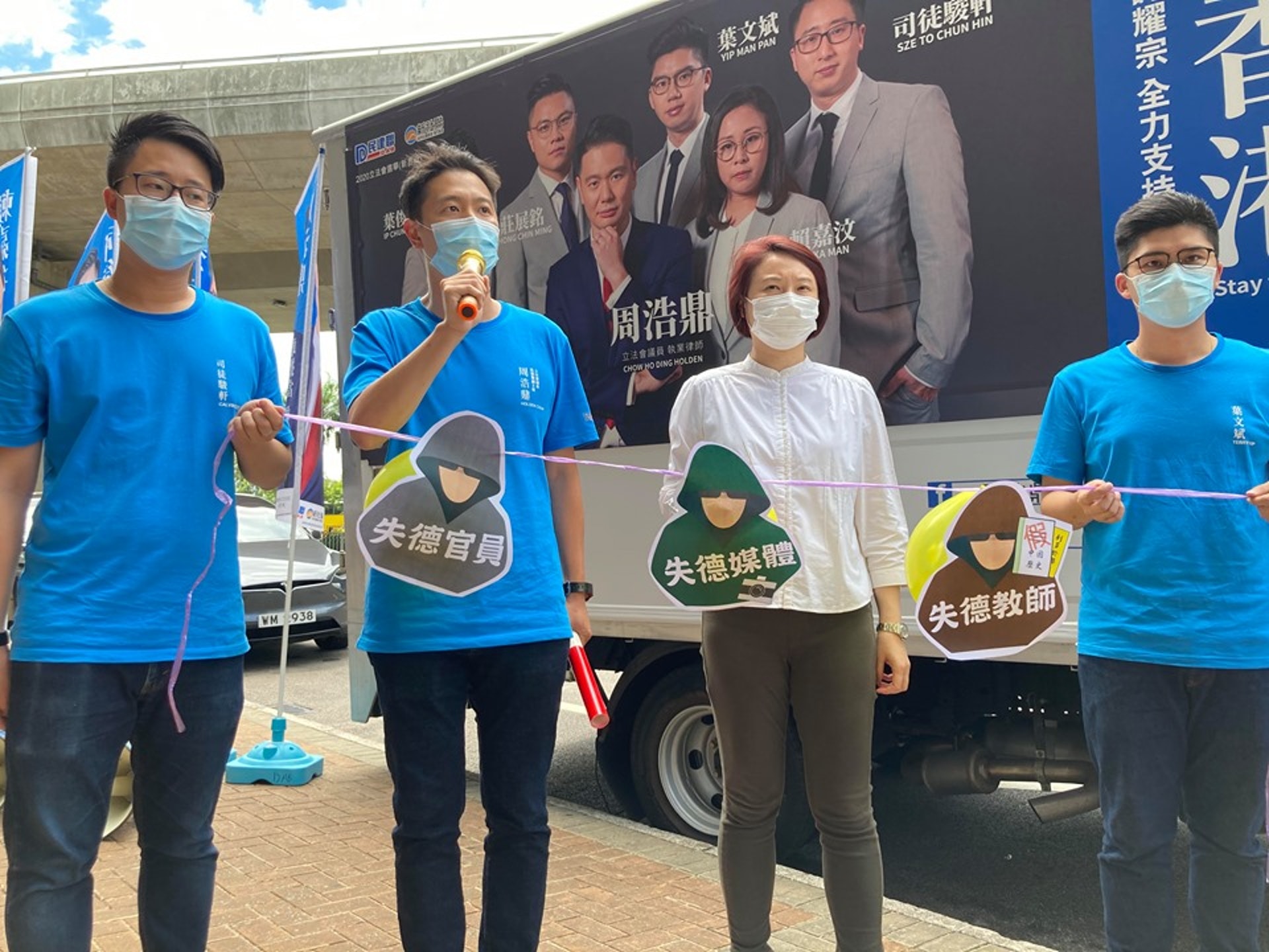 9 m& I# \% T( }公仔箱論壇王百羽表示無論會否押後選舉,都會繼續宣傳政治理念,李家偉補充指如何回應押後選舉需視乎「民主35+」陣營的抗爭意志。(張浩維攝)