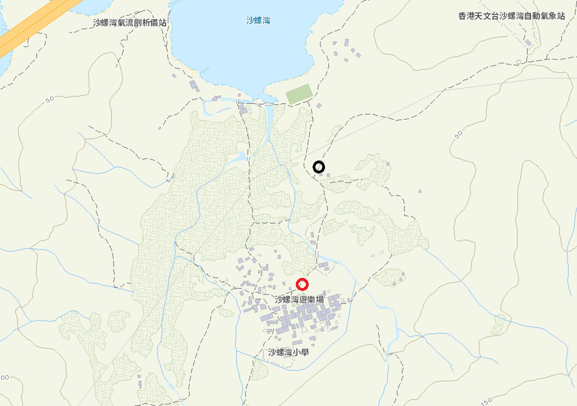 上月初村民亦在村口建閘(黑點示),今日行山人士則在另一處發現有鐵閘(紅點示)。 (地理資訊地圖)