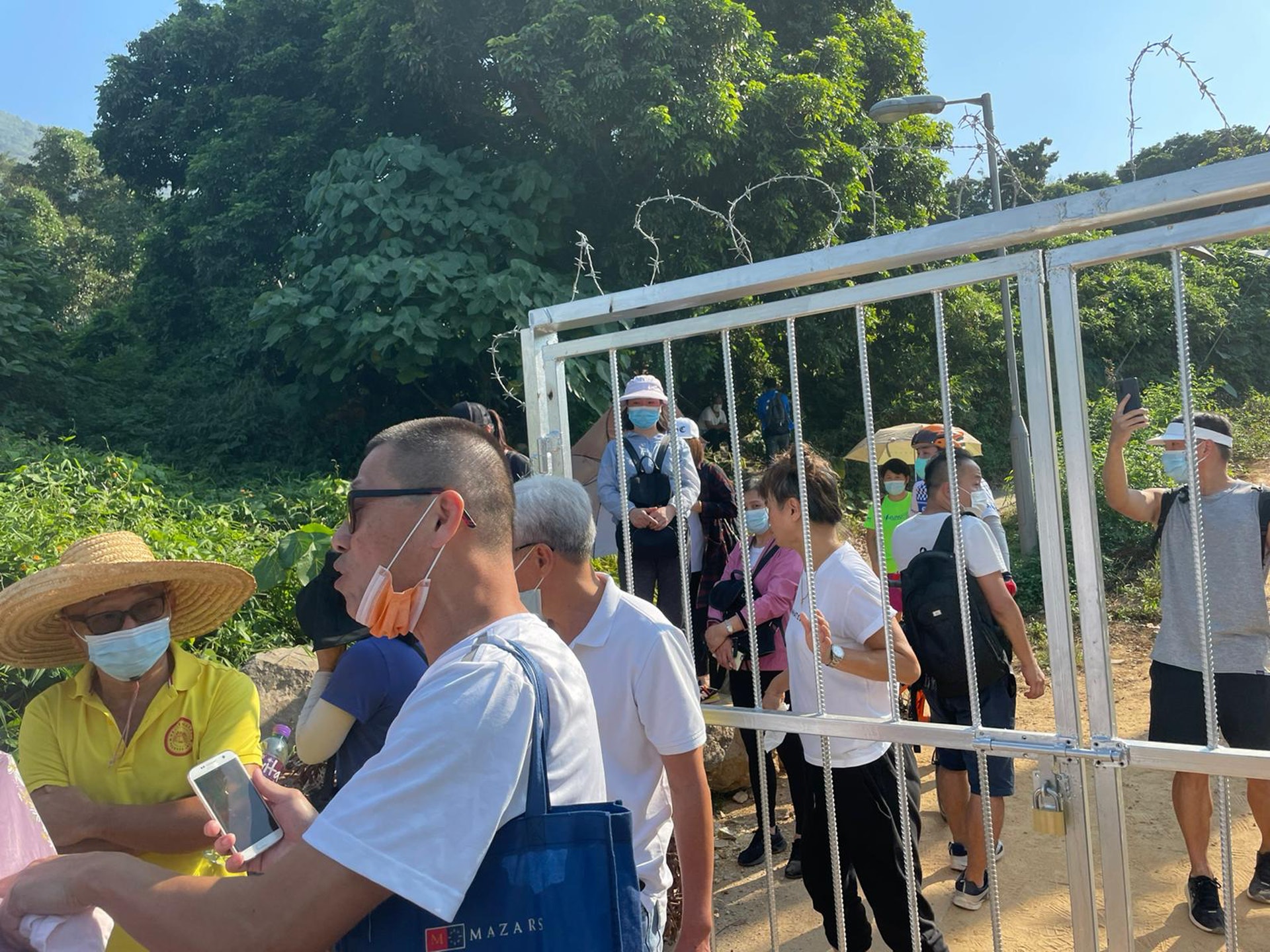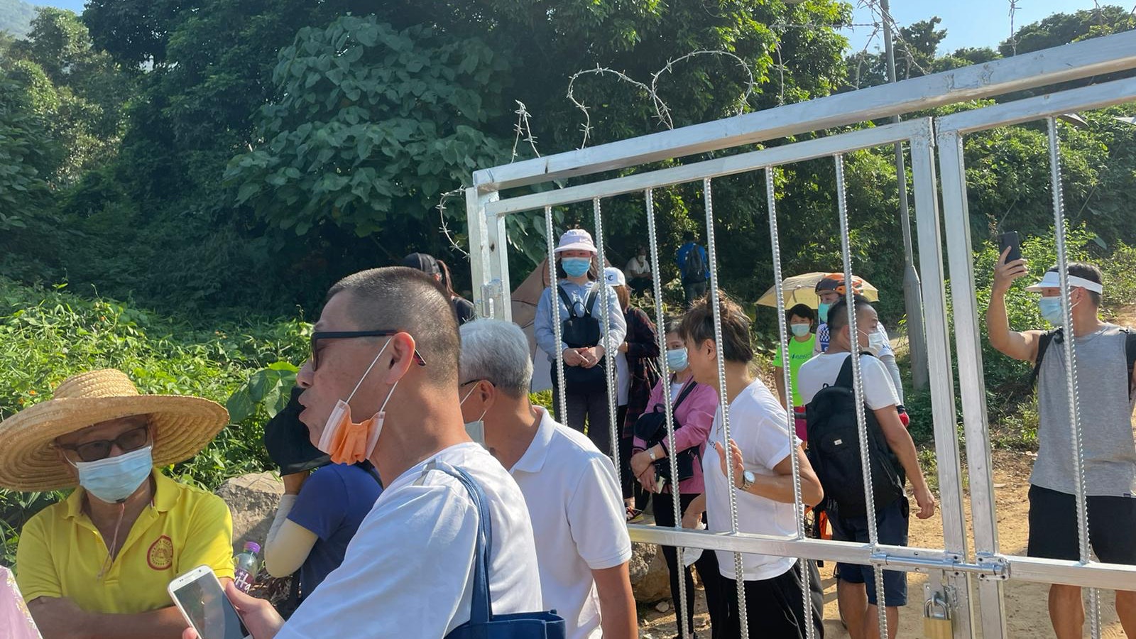 多名村民在閘前攔路,要求行山人士離開,有人更指要報警處理。(讀者提供)