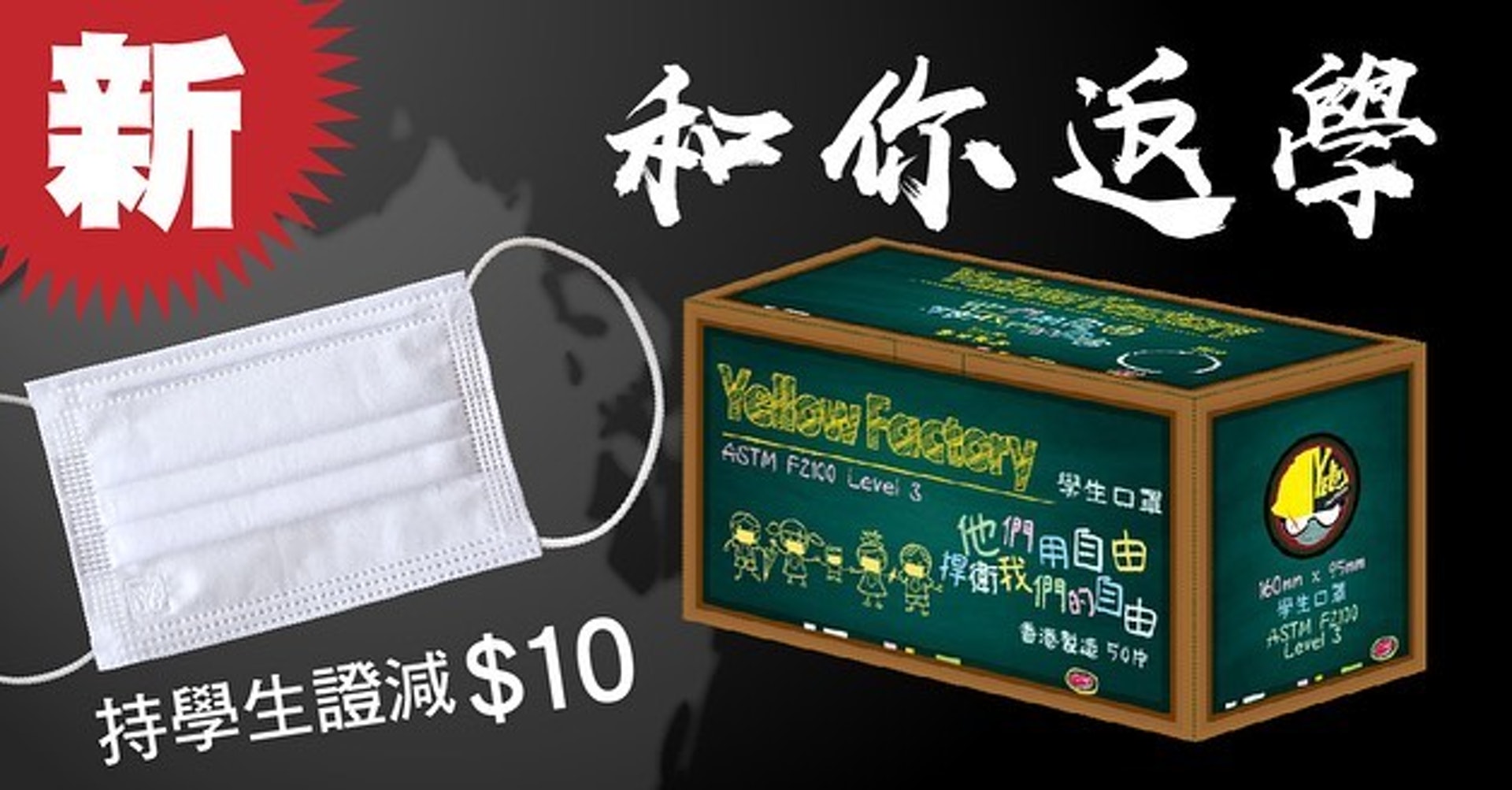 大公文匯的報道中指控「黃廠」近期推出多款「和你上班」及「和你返學」等不同系列的口罩,更聲稱要在校園延續「抗爭精神」。(黃廠facebook)