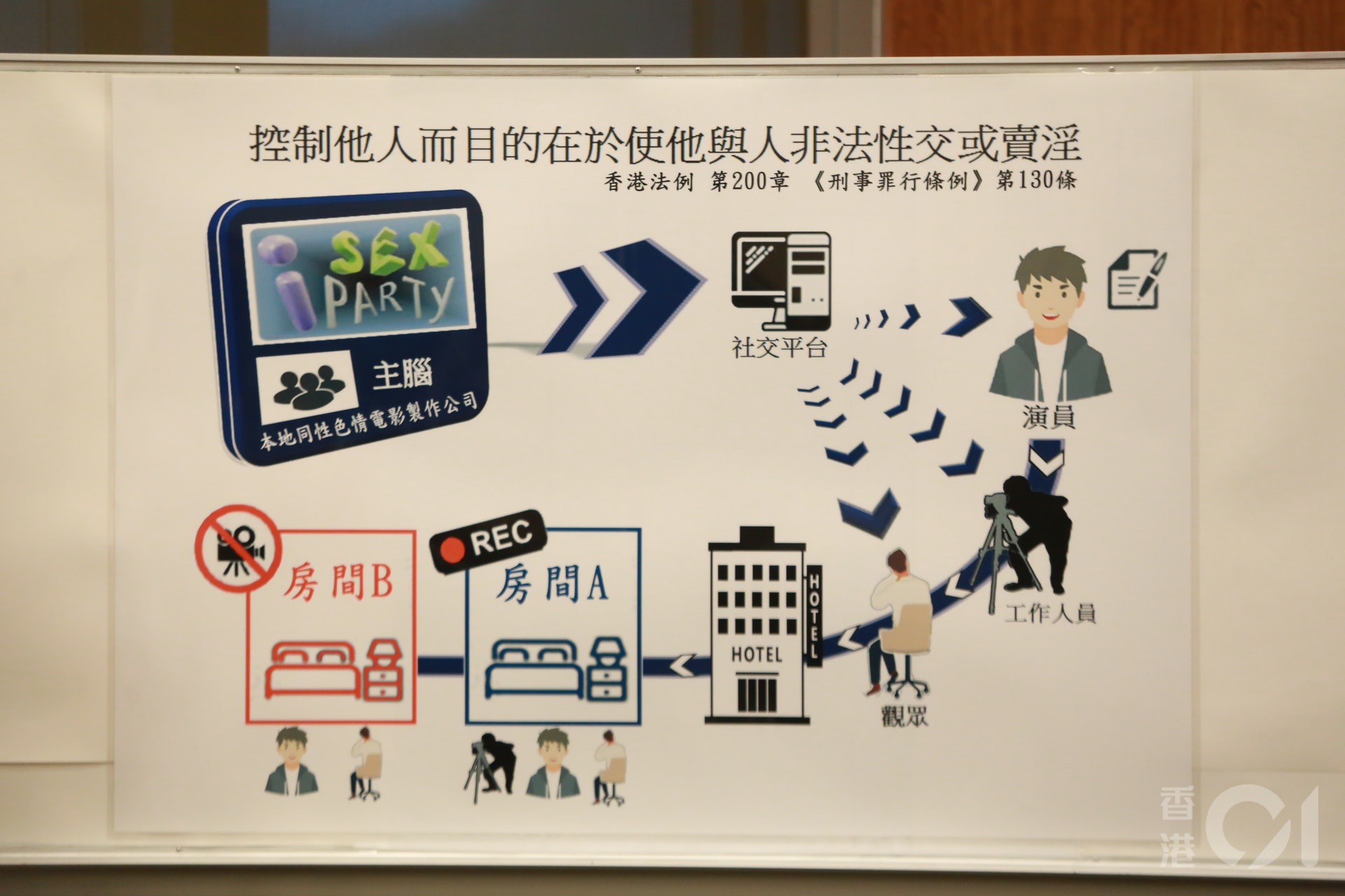 ; @1 x: h! ?5 \" @& s6 f: u/ t集團主腦在男同志社交平台招募演員、工作人員及觀眾,並訂酒店房作「AB房」,要求演員進行色情片拍攝及成人表演,並與觀眾進行性交易。(林振華攝)