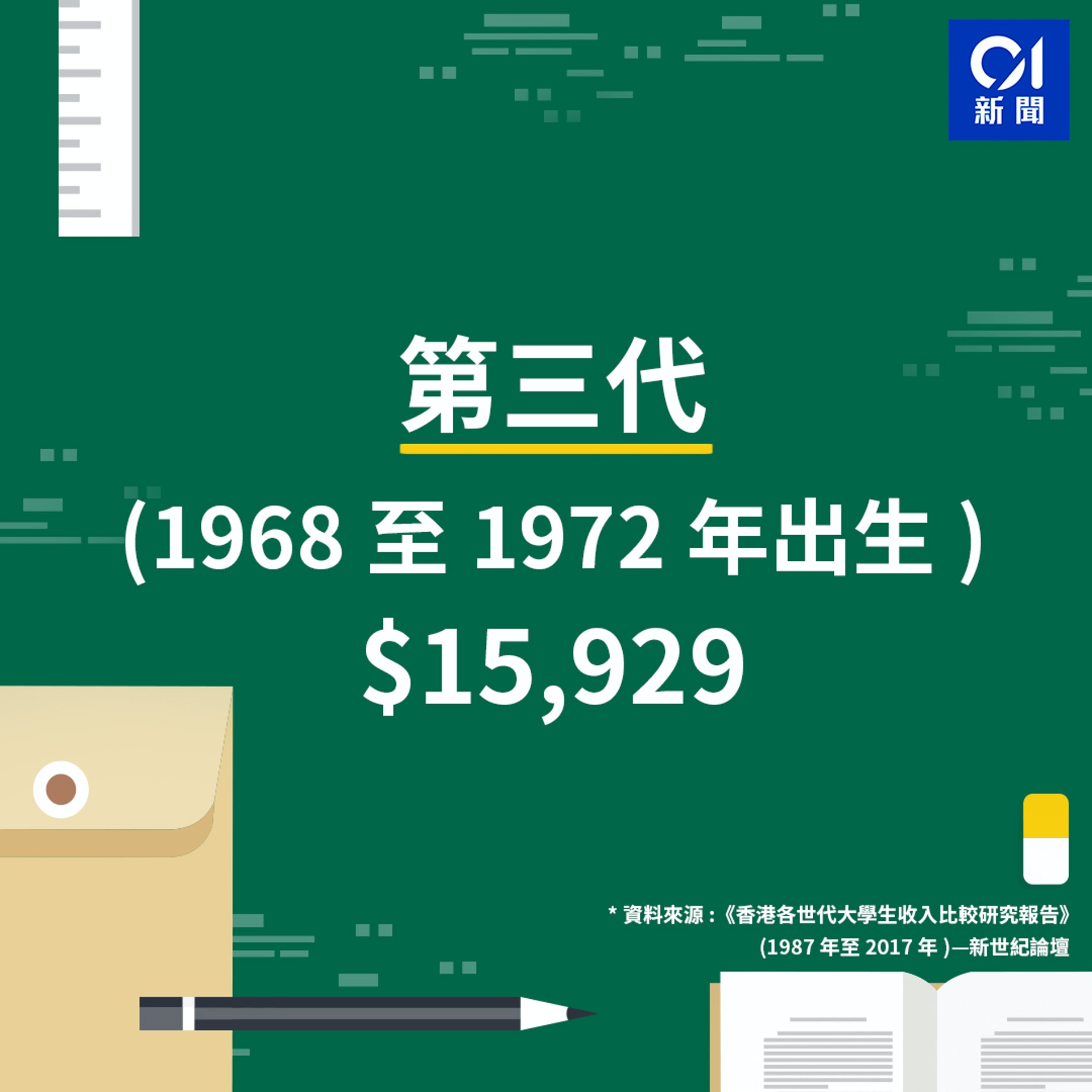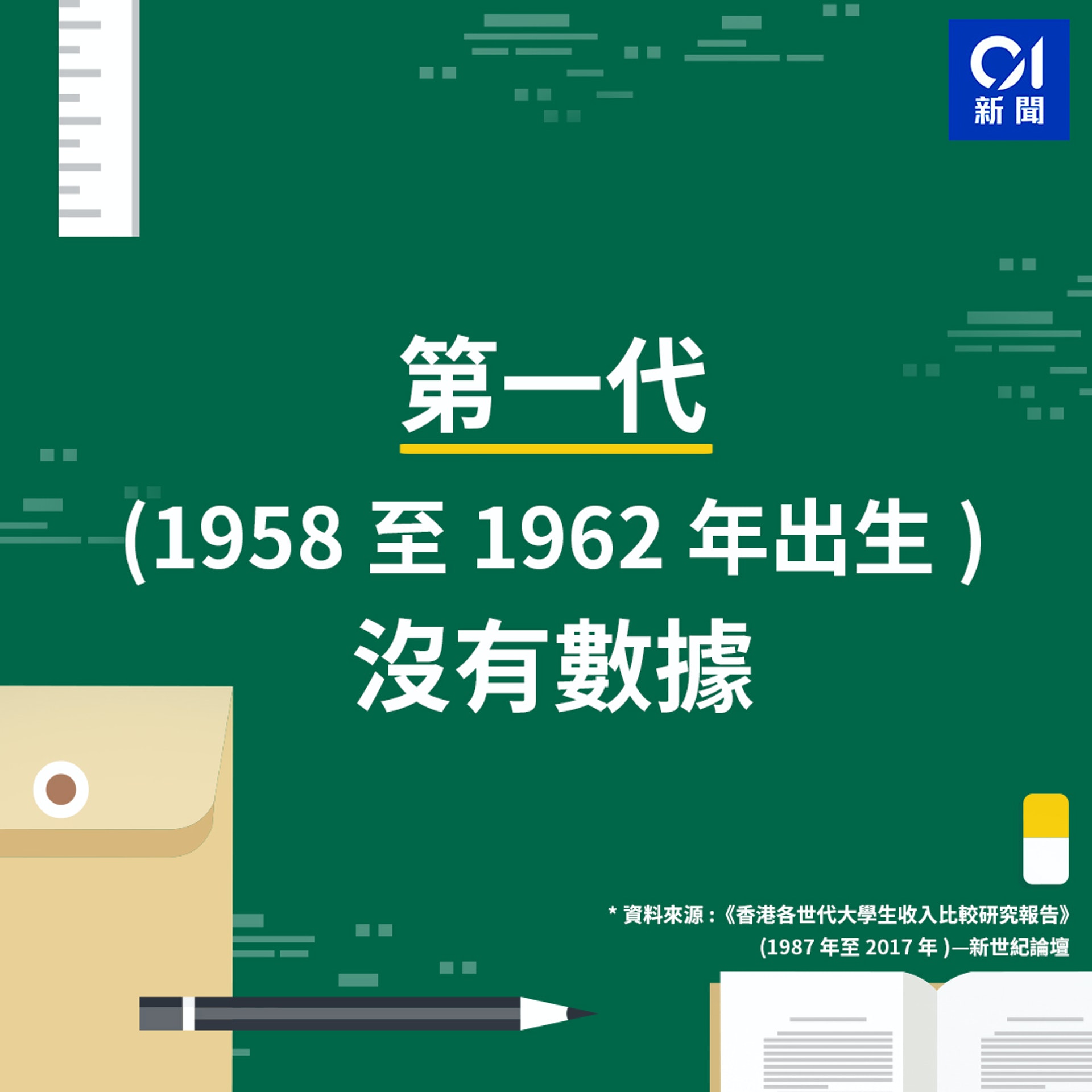 1 V( G6 ]1 e$ G2 M$ V# A, e; @1 Q調查以5年為一代,按綜合消費物價指數調整薪金,第一代大學生未能提供相關數據。(香港01製圖)tvb now,tvbnow,bttvb( U( a4 F' w& w& {