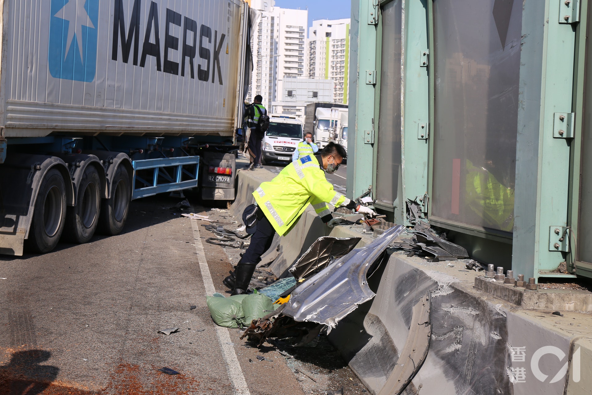 司機拋出車後,貨櫃車無人駕駛下溜後約100米,撞及左線1輛垃圾車始停下,近駕駛室位置的貨櫃門打開。(陳諾希攝)os.tvboxnow.com0 t3 ]: W8 @4 s) P# A
