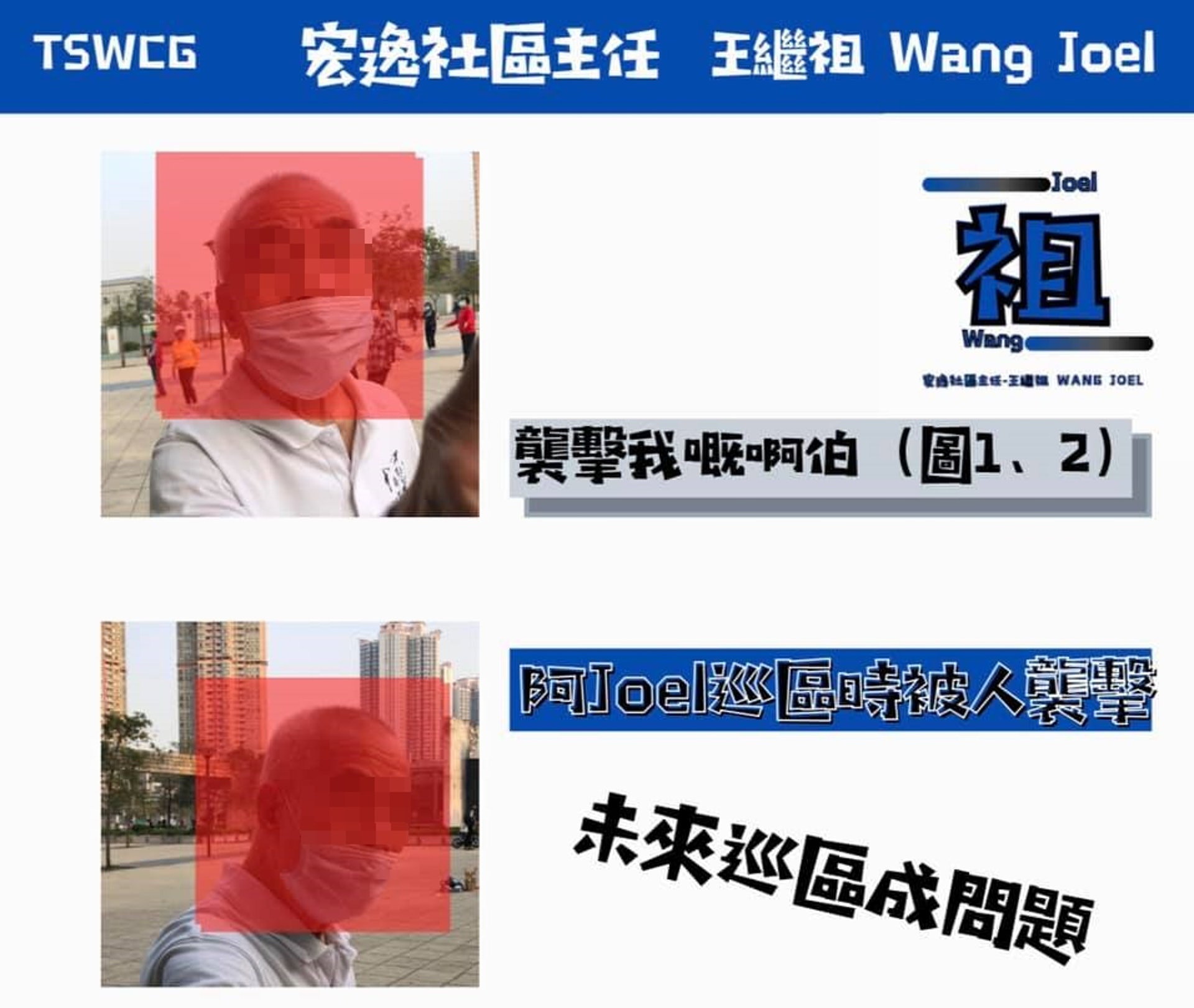 王繼祖周日晚上在「天水圍社區關注組」facebook直播,指下午5時許,與助理前往天秀路公園巡區時,發現一群「大媽」及老翁聚集跳舞。他稱,自己當時「好聲好氣」指,因接獲街坊投訴音量太大,促對方調低音量,豈料一名老翁發難怒罵,其後以頭撼向其門牙位置,又捶打其腹部,助理亦同樣被打。該老翁又試圖推向王繼祖,一名老婦阻擋時亦被推跌,「咁危險情況下,我哋被人打冇所謂,阿婆被人推跌可大可小」。此外,亦有在場人士出言恐嚇,稱「你再留喺度,我斬你全家」。公仔箱論壇* C0 z9 _4 Y$ M5 E- x# N- r