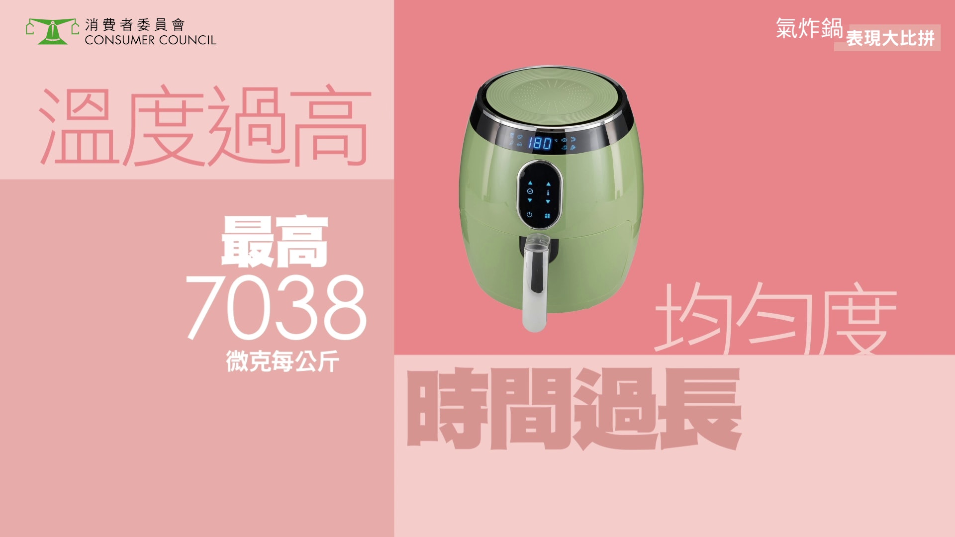 消委會委託獨立實驗室進行效能測試,根據樣本說明書指示及代理商提供食譜,測試急凍薯條、雞膇及春卷的表現,並量度烹調時的中心溫度及耗電量。