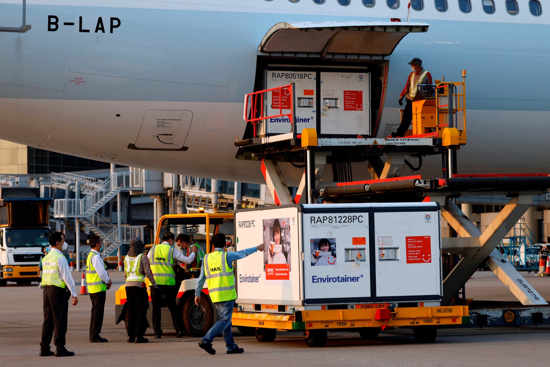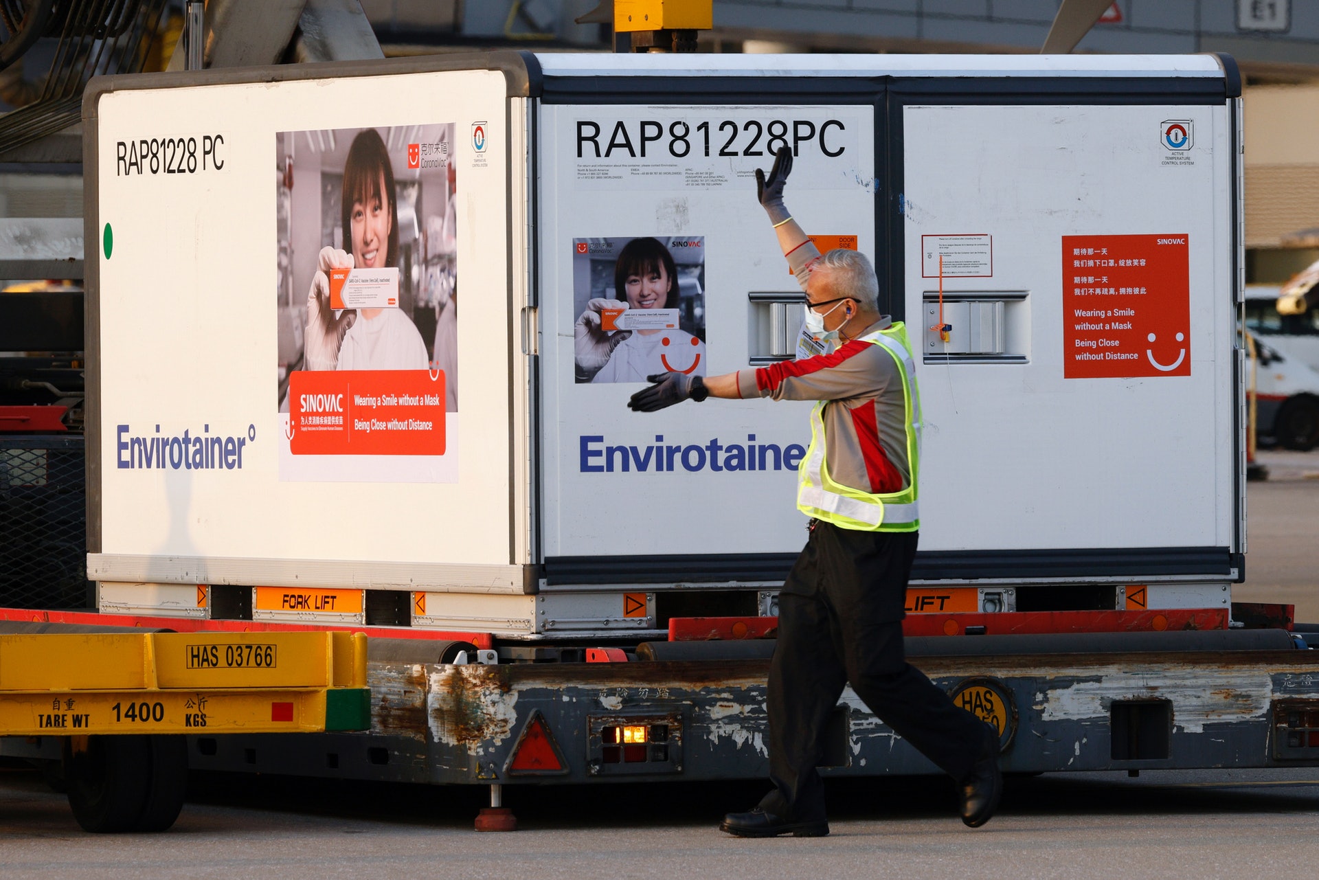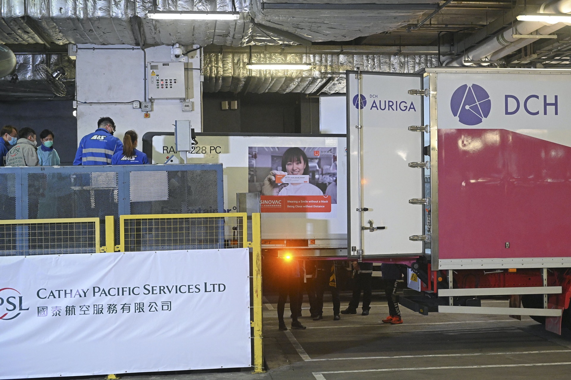 2021年2月19日,內地科興生物的首批100萬劑滅活疫苗運抵香港。(路透社)