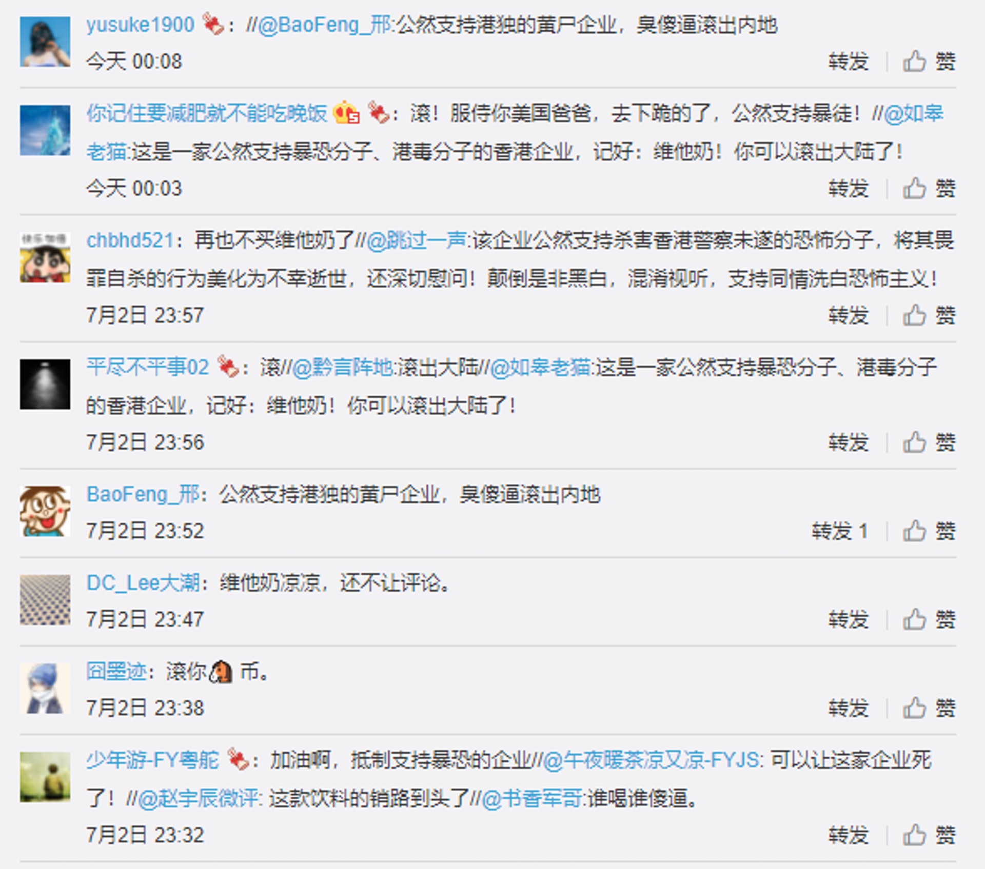 6 f2 N. [5 _8 \$ E7 l. f內地網民要求維他奶「滾出大陸」,並揚言即日起全面抵制維他奶產品。(維他奶微博截圖)tvb now,tvbnow,bttvb- a( S. \ E, J/ M; ~7 x& F5 D# X! n