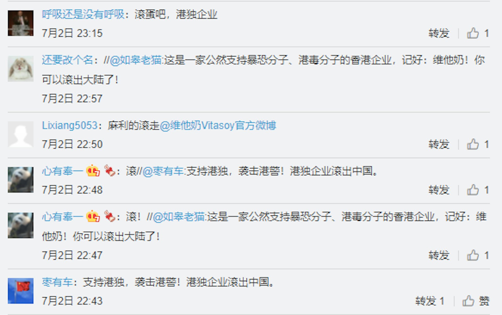內地網民要求維他奶「滾出大陸」,並揚言即日起全面抵制維他奶產品。(維他奶微博截圖)! V" X3 ]/ L" W6 i( T2 F8 l( g