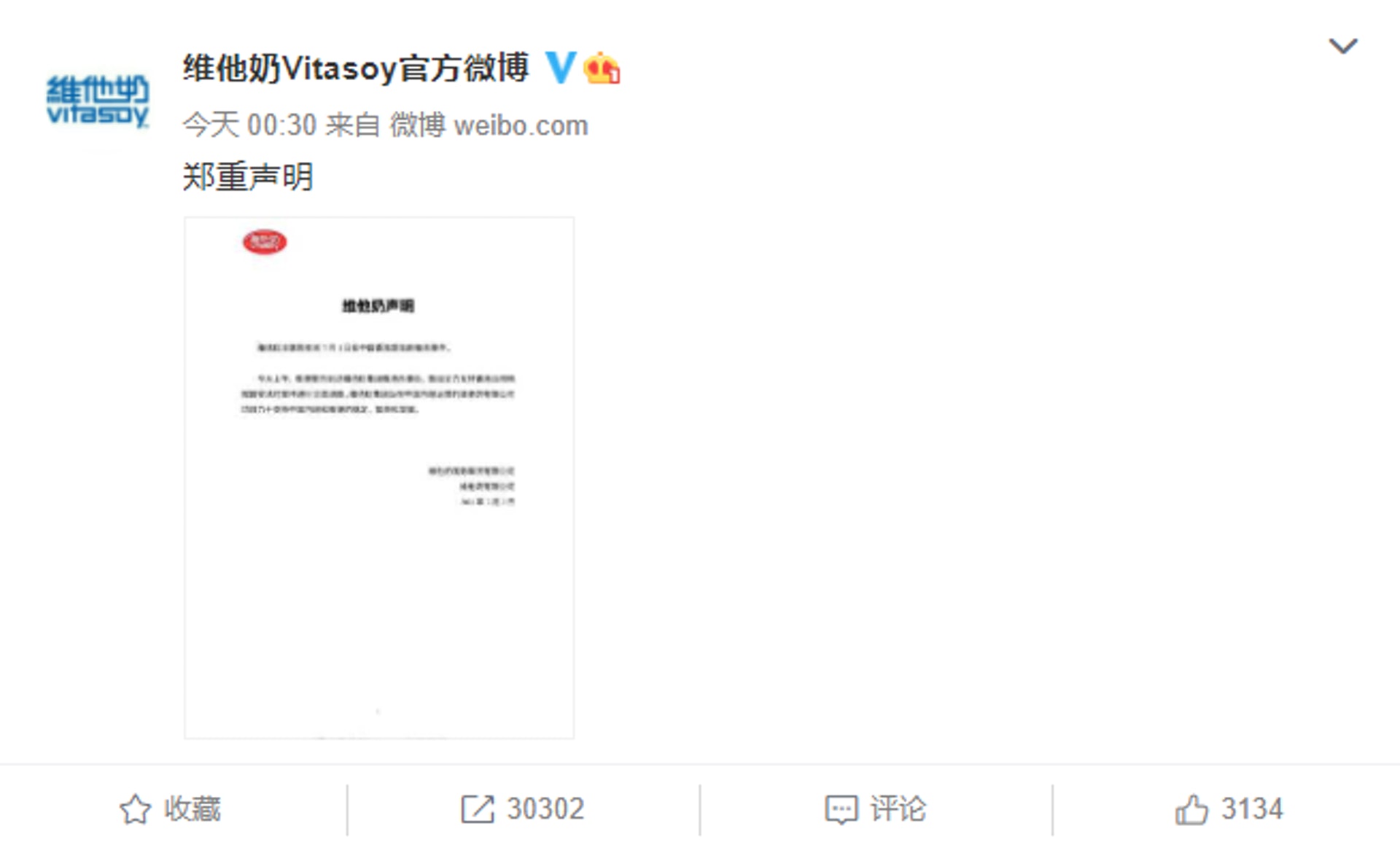 - X" M1 a1 r8 z( v# P$ L(維他奶微博截圖)