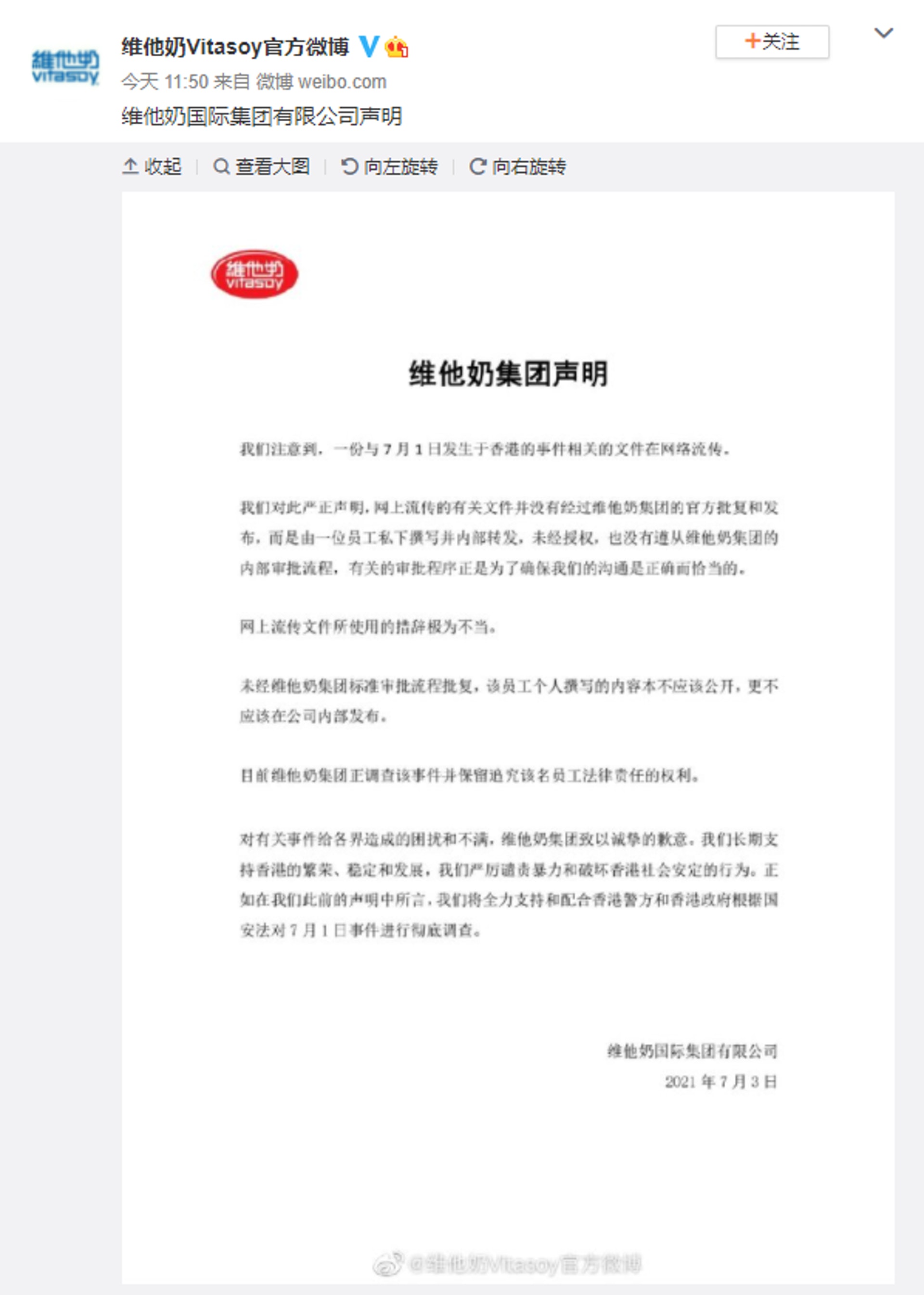 不過此聲明似乎未能平息內地網民怒火,他們留言批評維他奶「找個臨時工揹鍋」、「甩鍋第一名」、「避重就輕」等,又指未見聲明在Facebook及香港官網出現,質疑公司取態見風使舵。