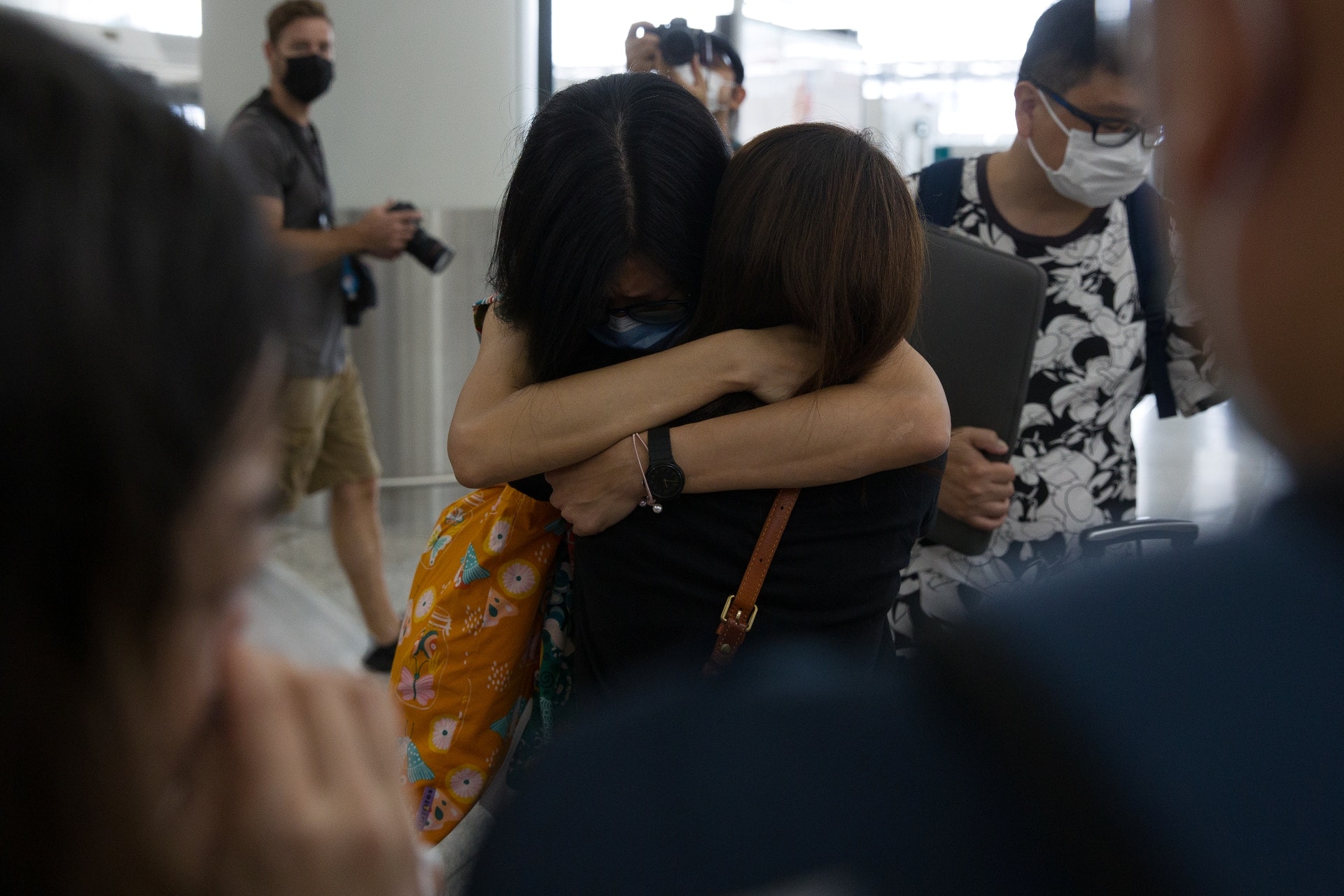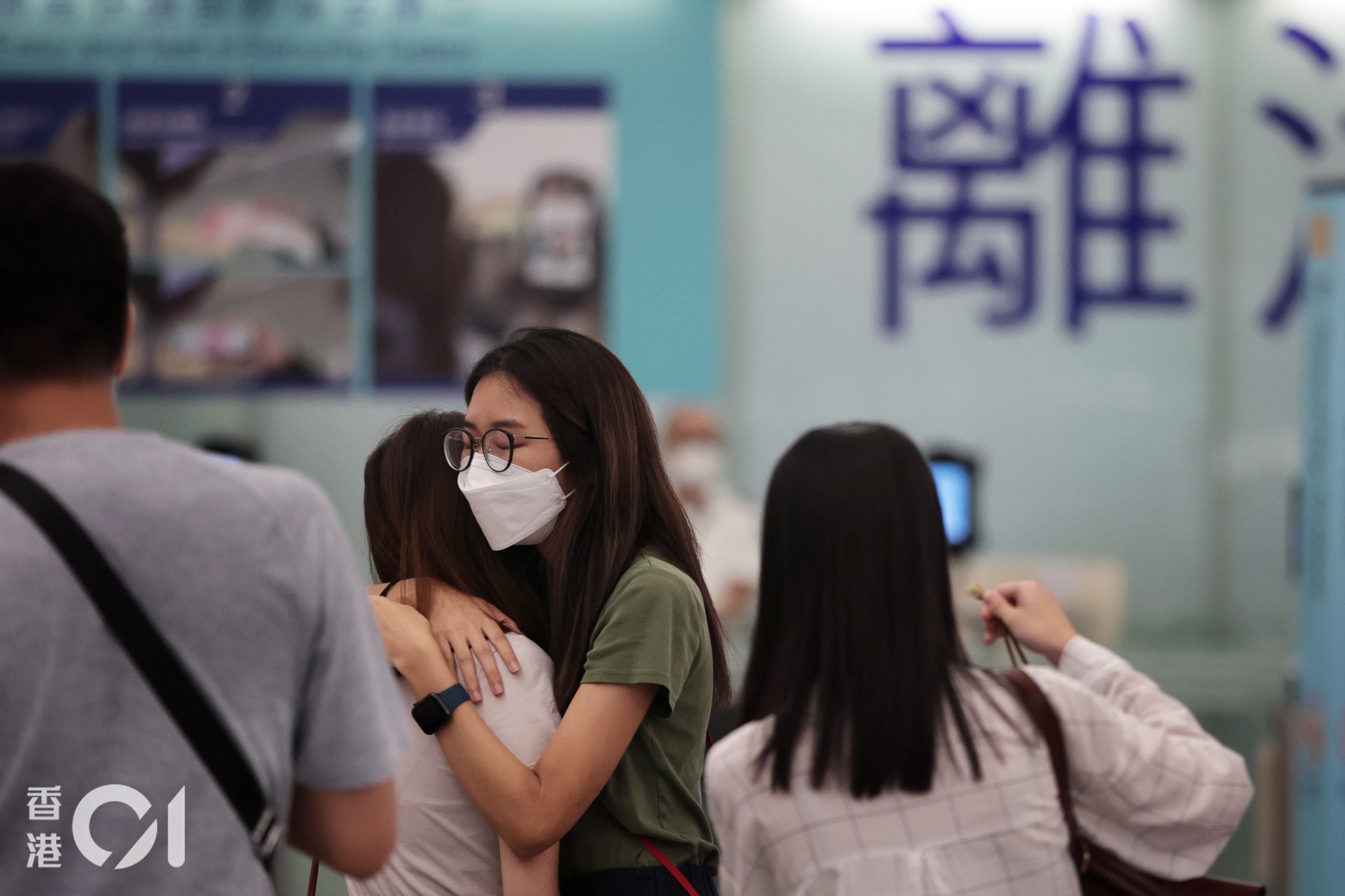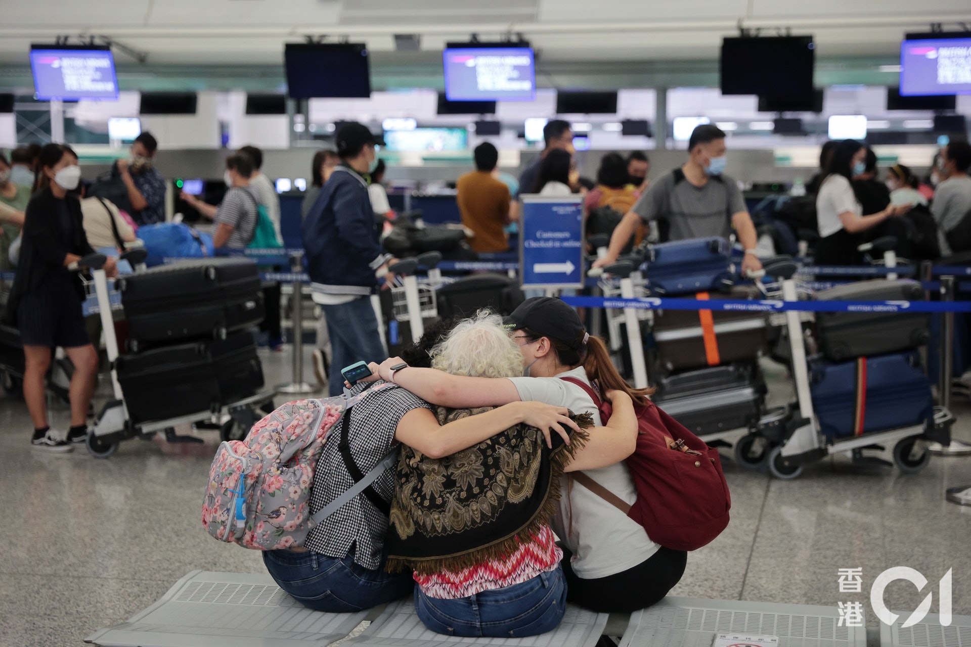 6月30日晚上,機場離境層又是一幕幕送機和依依不捨情景。(李澤彤攝)6 W" P0 l& R% d8 v3 k1 l+ Q