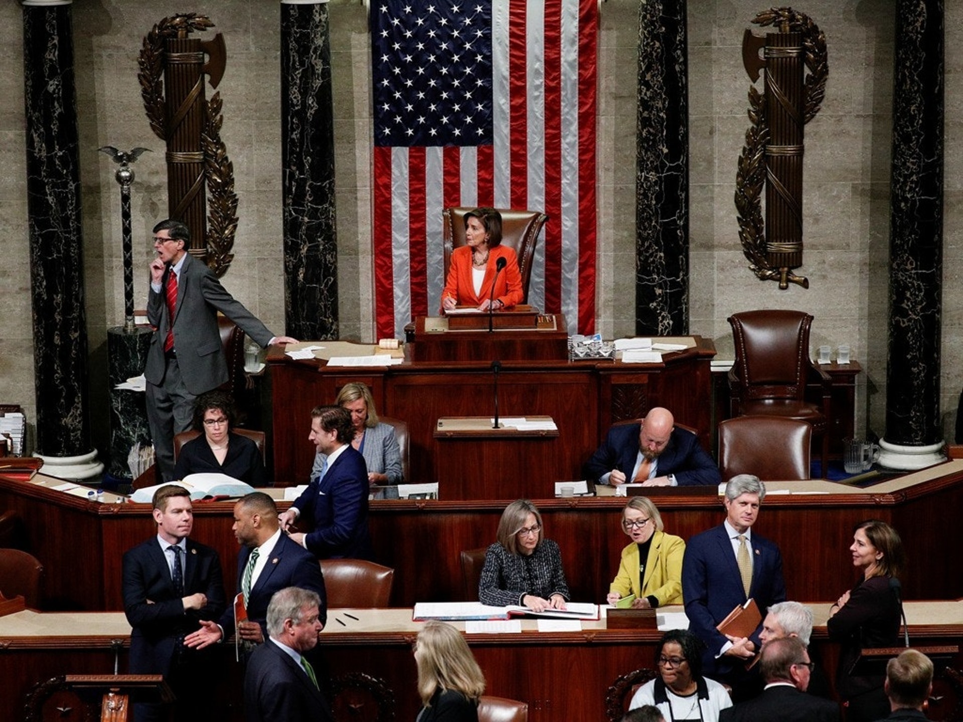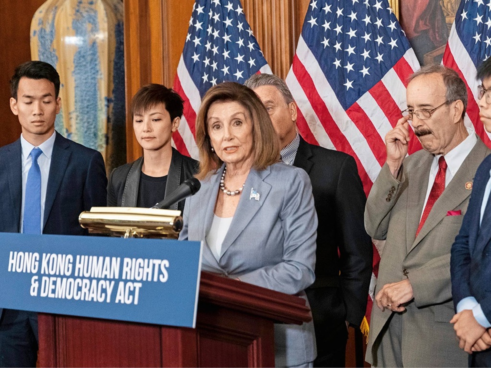 & O% h& ^3 D% ?, H2 R9 v n美國眾議院議長佩洛西(Nancy Pelosi,右)把《香港人權與民主法案》送出國會並遞交總統特朗普(Donald Trump)簽署(路透社)