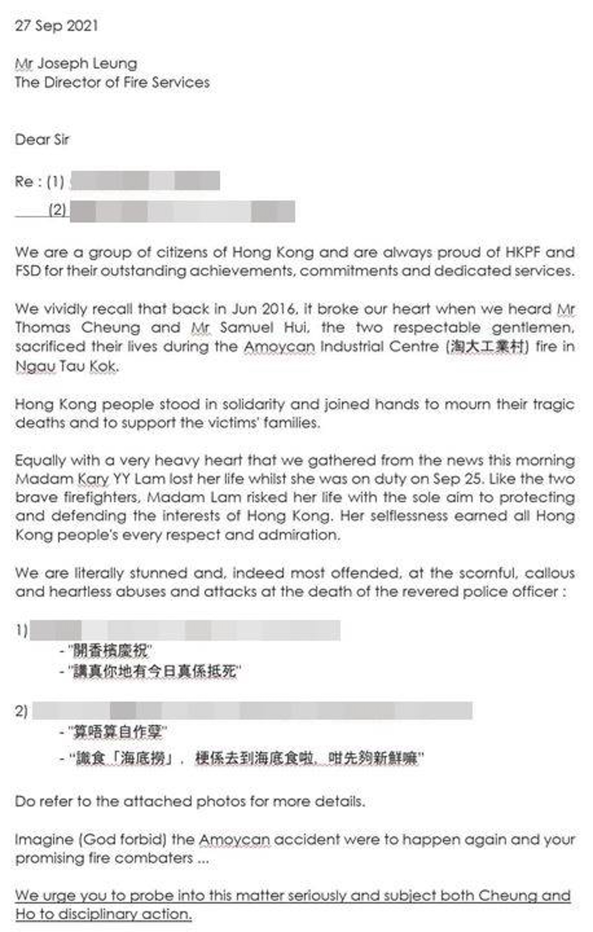 根據流傳的投訴信內容,有市民在本月27日去信消防處處長梁偉雄,指名道姓投訴兩名消防員,指他們在社交平台上留言:「開香檳慶祝」、「講真你地(哋)有今日真係抵死」、「算唔算自作孽」、「識食『海底撈』,梗係去到海底食啦,咁先夠新鮮嘛」。