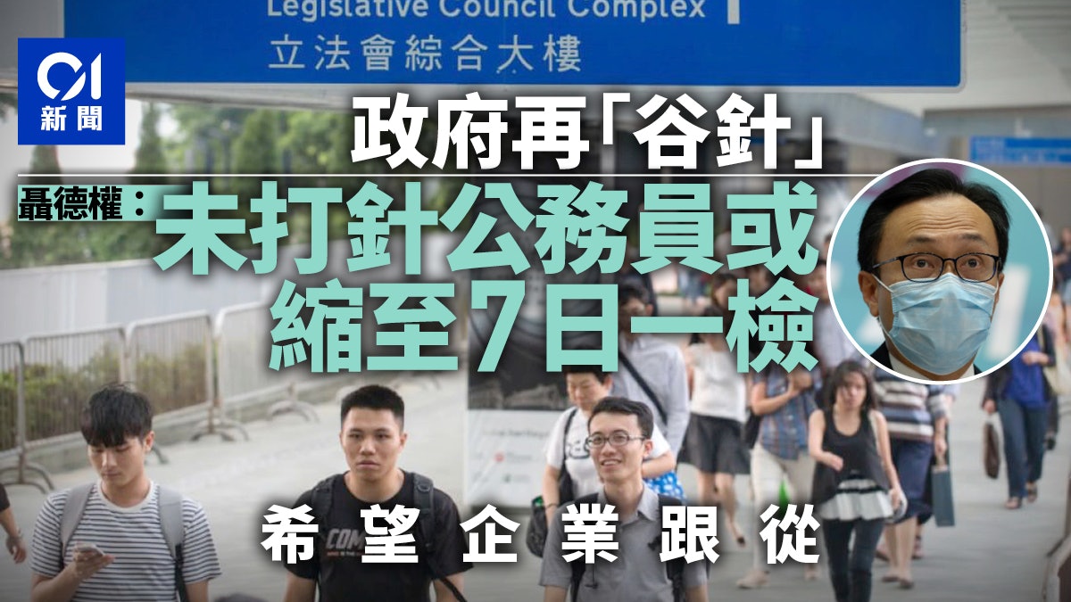 政府近月連番「谷針」宣布,合資格人士可接種第三針新冠疫苗。公務員事務局局長聶德權今日(7日)於電視節目上表示,現時20至59歲群組的接種率已逾七成,如要進一步推高接種率,需要企業協助,包括可參考政府做法,要求未打針員工需定期接受檢測。現時未打針的政府僱員,需每兩周檢測一次,聶透露,可能將日數縮短為7天,希望企業跟從。