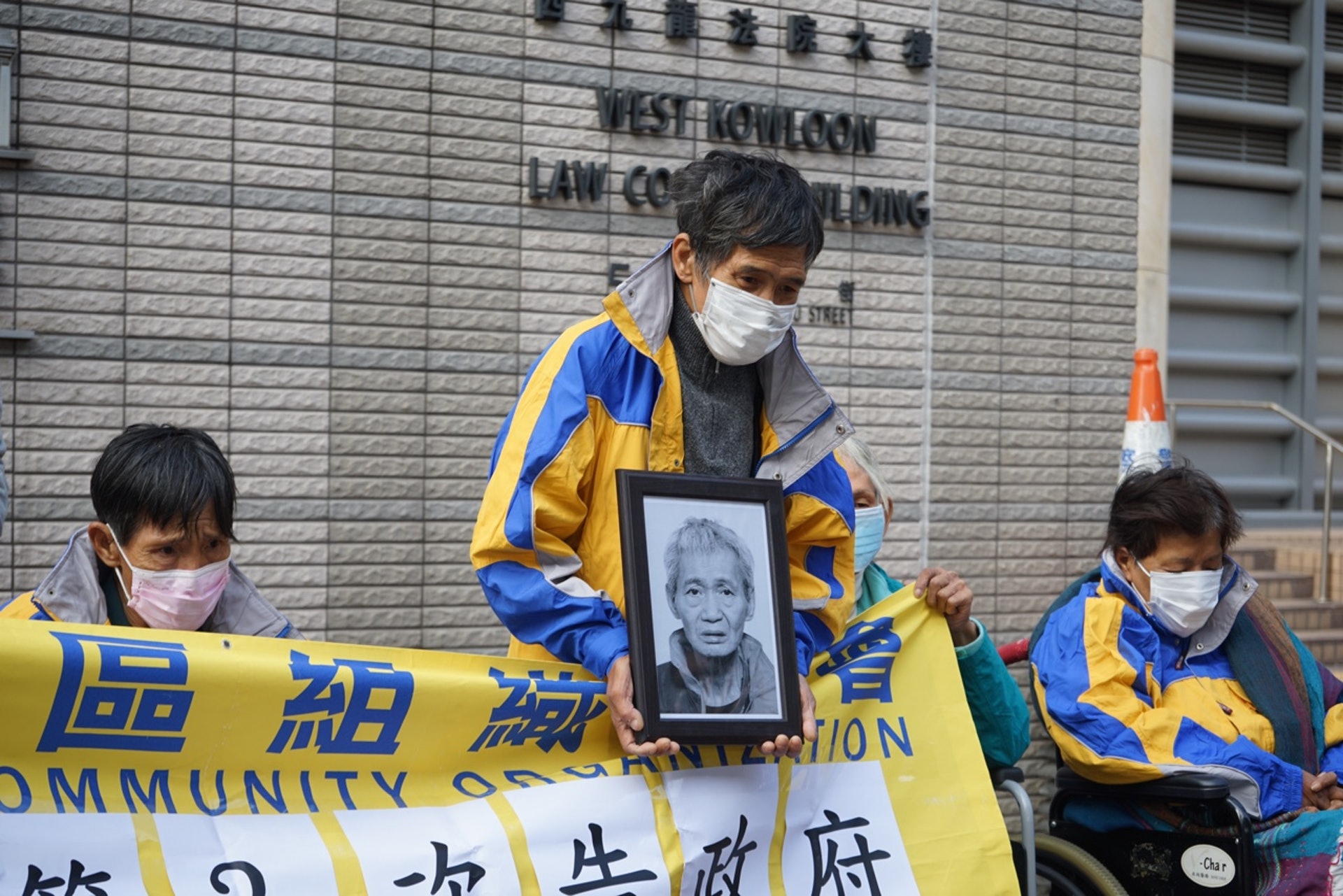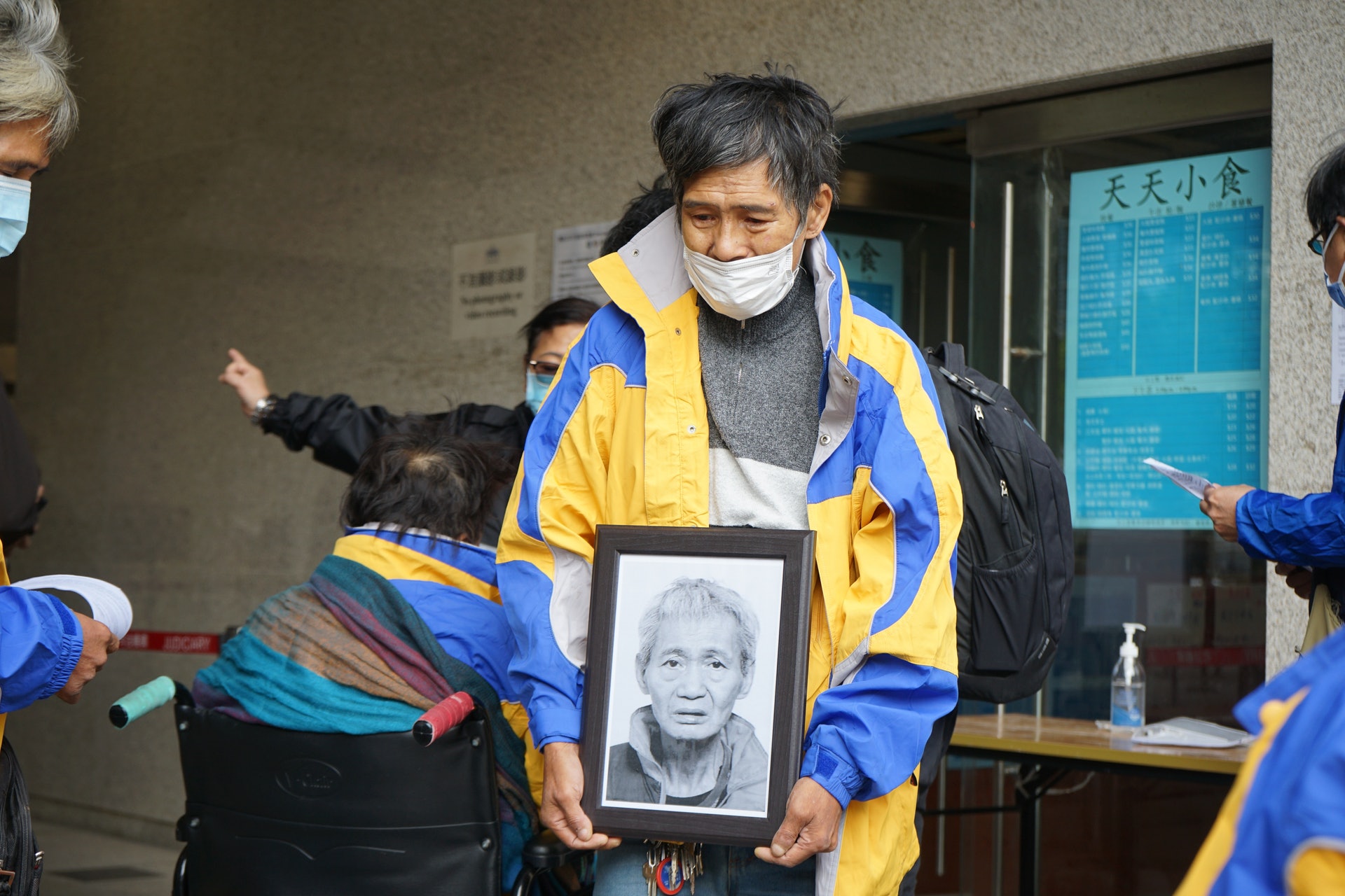 申索人馬月榮上月離世,其表弟周雄光拿著其表哥的遺照,代馬繼續申索。(呂諾君攝)% ~, i5 r0 p+ Y