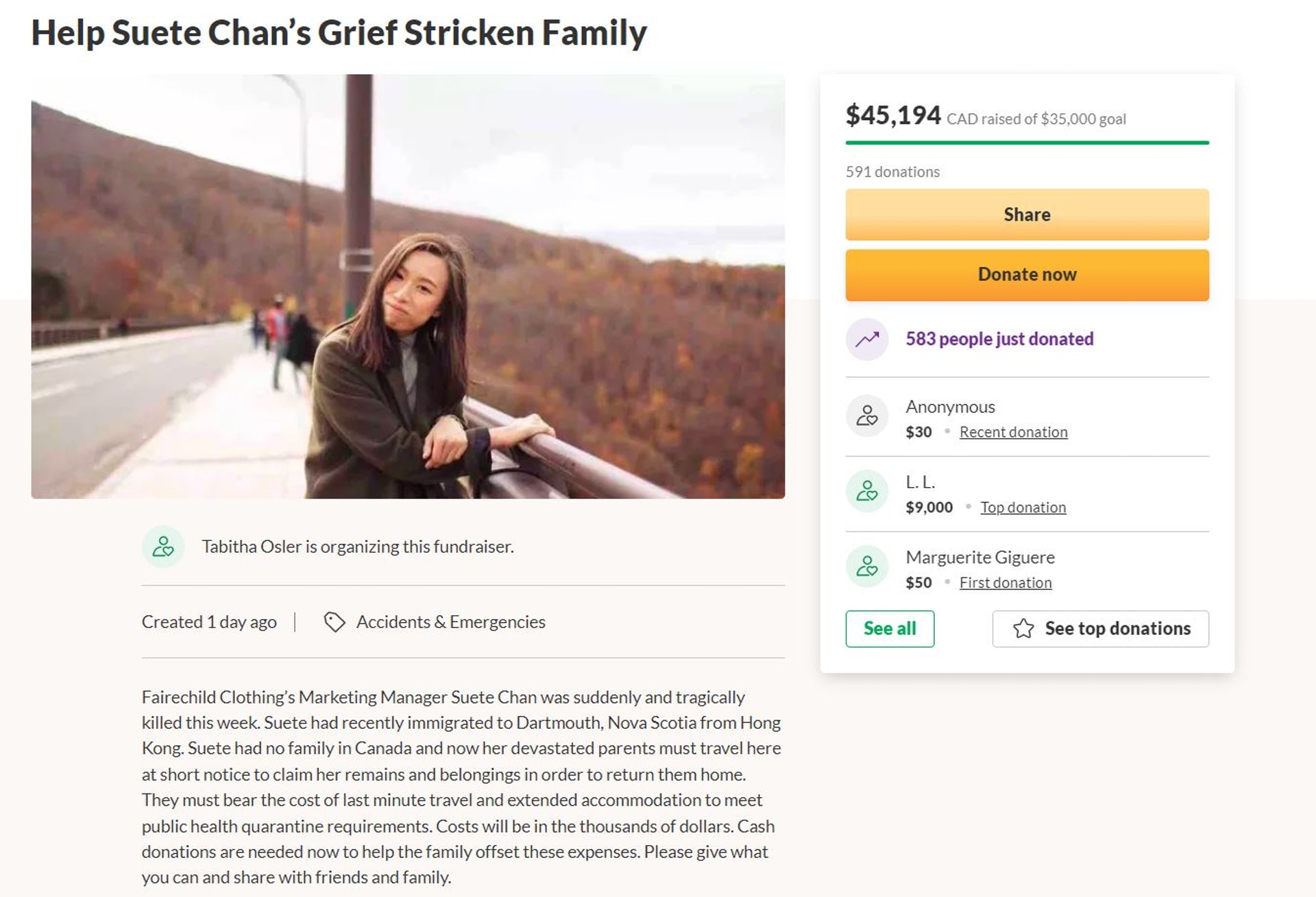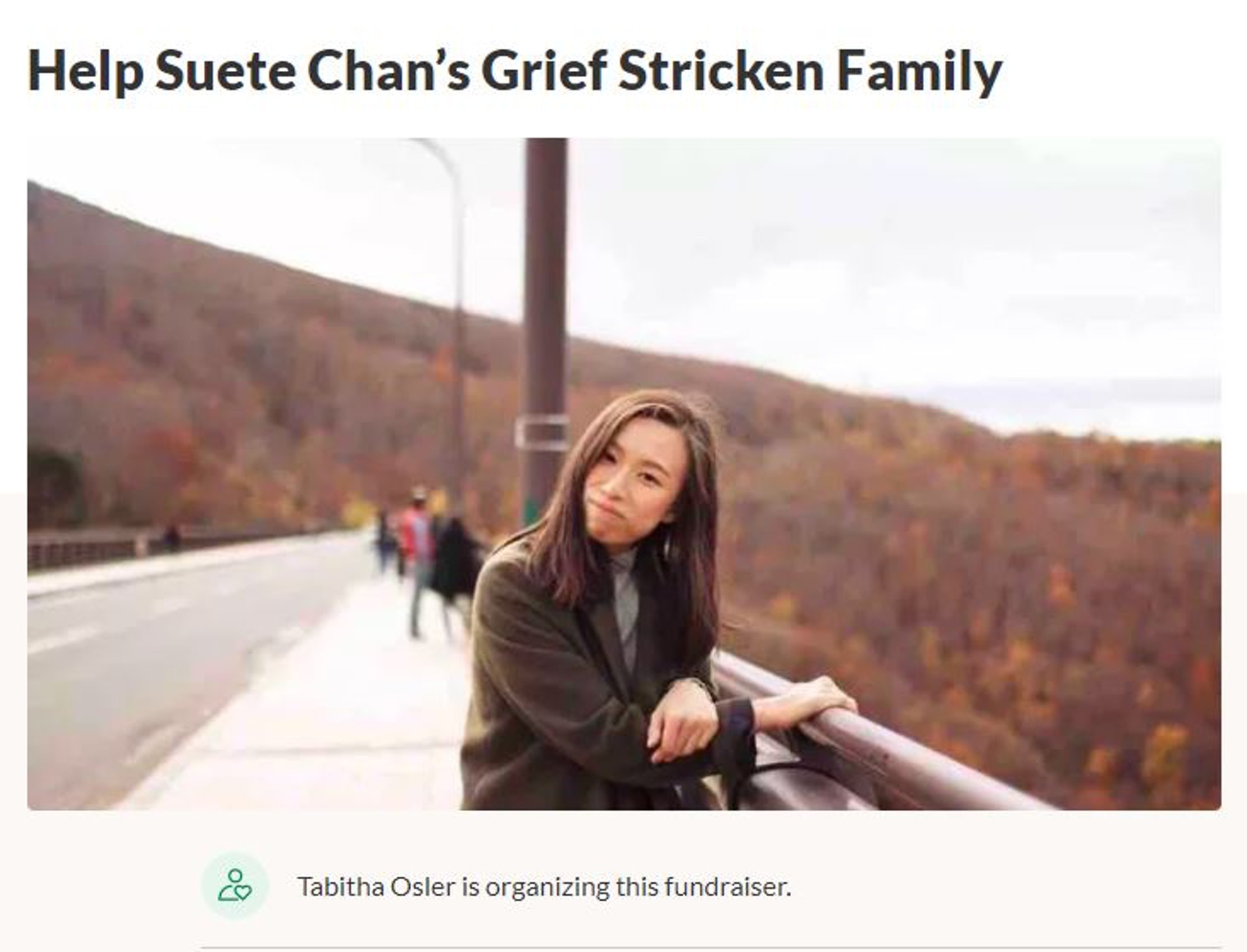 3 f5 X" ?) o% s6 A9 T) j公仔箱論壇一名27歲香港女生Suete Chan(姓陳)約半年前移民加拿大,本周三(24日)上班途中被私家車撞傷,送院後搶救不治,她本來將要在周五(26日)迎接28歲生日。陳的一對居港父母需要遠赴異地為愛女辦理身後事,其僱主指開支龐大,遂發起眾籌3.5萬元加幣(港幣約 213,000 元)希望幫助陳的家庭,短短一日內已超出目標。其僱主接受當地傳媒《The Signal》訪問時指,陳是一個非常可愛、甜美、友善的人,並指她對工作充滿熱誠,亦結交了不少朋友。/ P/ ~5 N$ U+ }3 Z