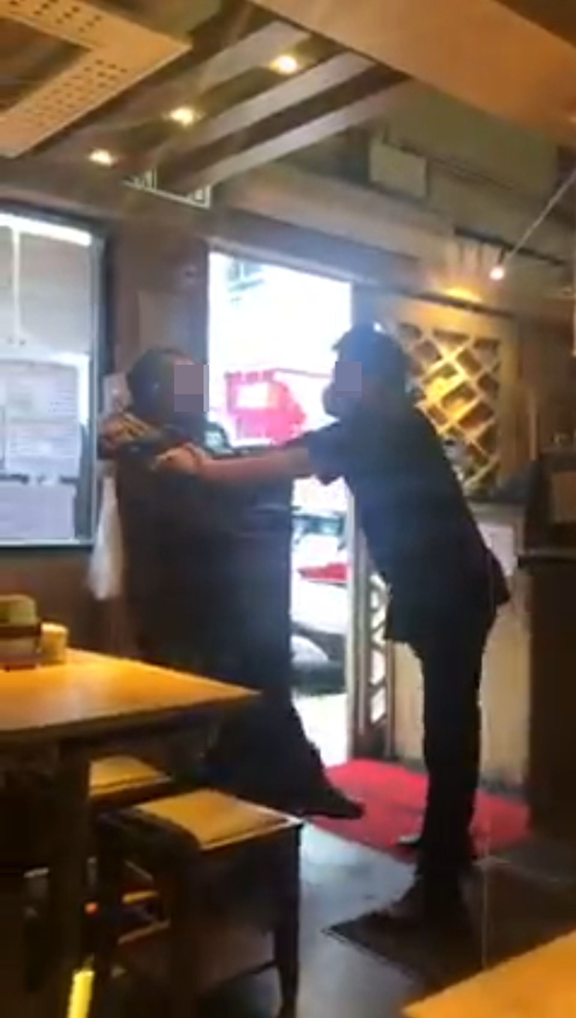 4 C: h/ s; L& @os.tvboxnow.com現場是位於上水符興街的御八築地,事發於今午約2時半,一名男食客疑拒絕使用安心出行,因而與男職員發生口角,雙方更出手推撞。從網上一段短片所見,當時男食客與男職員四手交纏「黐手」推撞,男顧客大喝職員:「你係咪要打呀?」男職員反駁:「我冇郁手呀,係你郁手咋!」