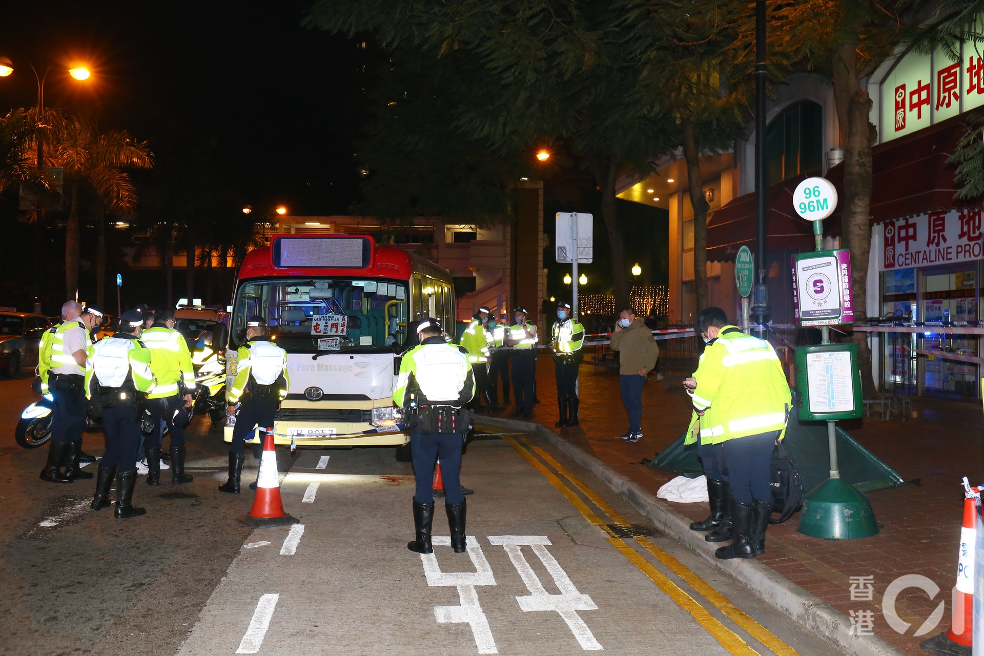 現場所見,警員圍封小巴,蹲低用電筒檢查車底,男子遺體用綠色帳篷蓋著,並放置在行人路旁。小巴司機神情黯然,被警員帶上警車調查,車頭左邊輪胎遺有小量血跡。& q' I5 K; ~( x