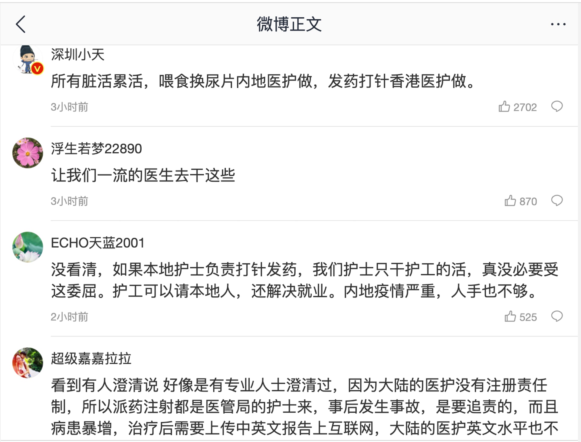 微博上有批評指,內地護士做護工(病房助理)的工作是「委屈」。不過,有本港護士指出,護士工作向來包括換片、餵食、抽血等,呼籲不熟悉護士工作的人勿煽風點火。