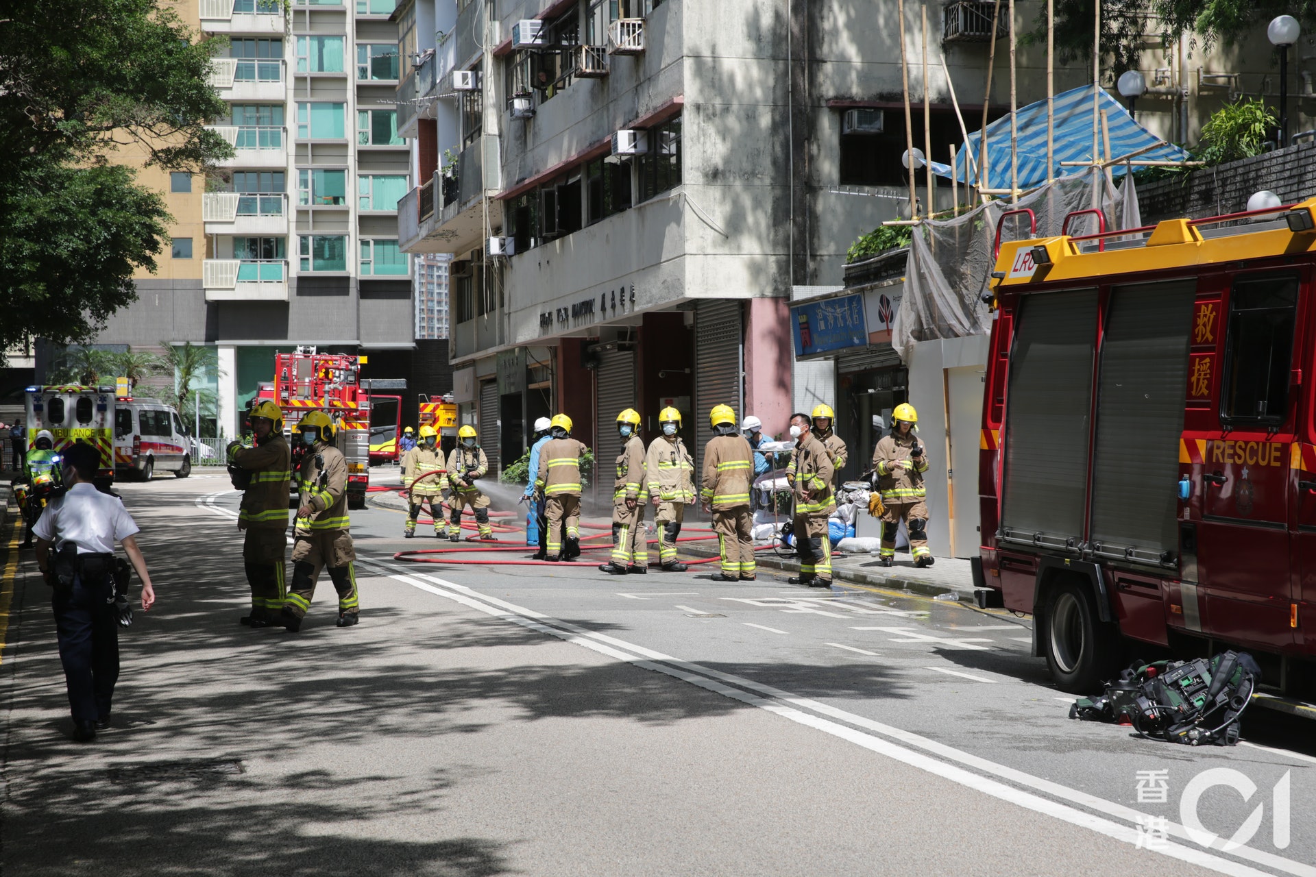 , E* b) r# }: n9 Y6 t% t( \: H* K男事主手腳、頸部嚴重燒傷,由救護車送院救治。(黃偉民攝)* |8 U3 n* l: O2 ~/ W