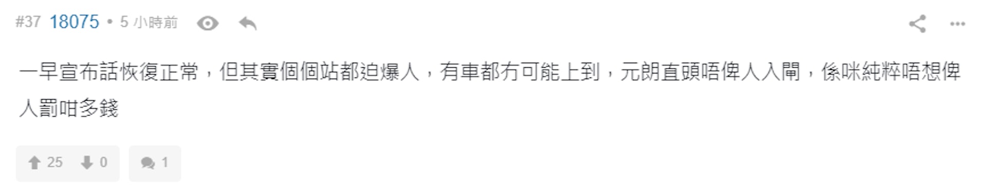 港鐵不時出現信號或人為故障,令一班打工仔叫苦連天:「死沙田圍站都搞到屯馬全線崩潰」、「見到天水圍天耀巴士站打晒蛇餅以為炒車,原來係炒鐵」、「宣布話恢復正常,但其實