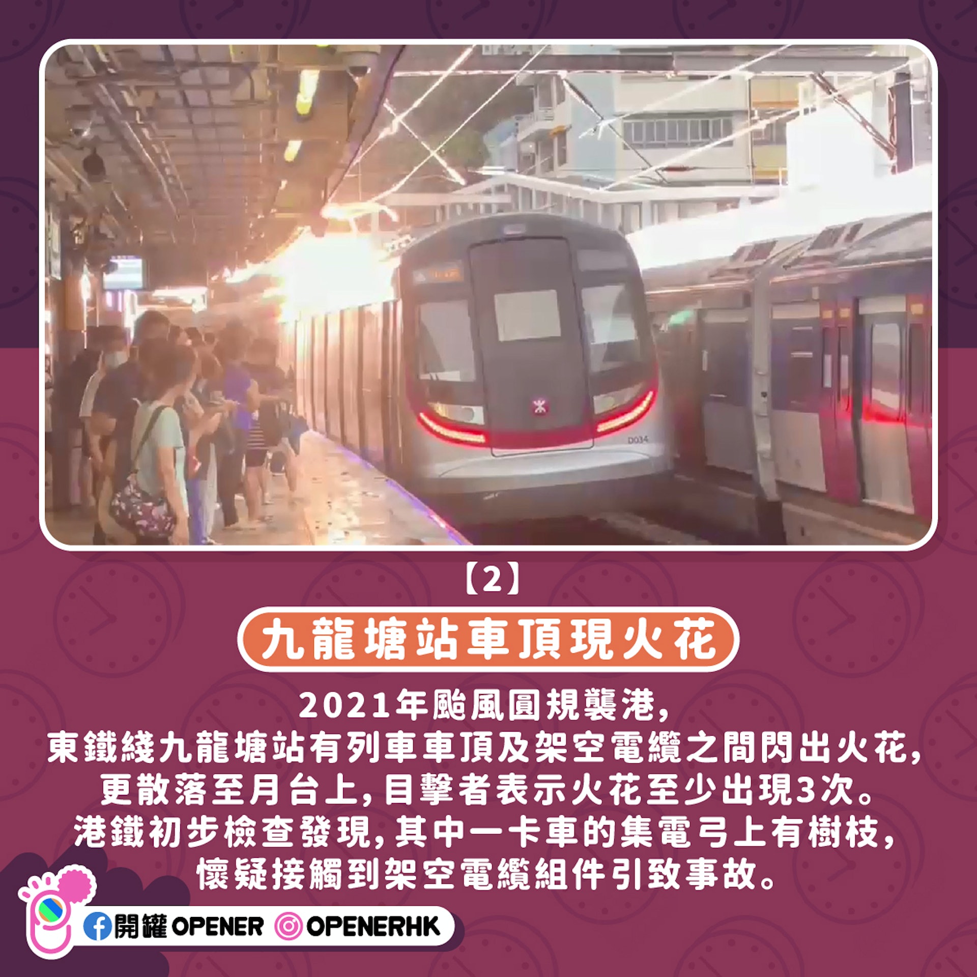 . ^6 a! |! p* l: ?, }2021年颱風圓規襲港,東鐵綫九龍塘站有列車車頂及架空電纜之間閃出火花,更散落至月台上,目擊者表示火花至少出現3次。港鐵初步檢查發現,其中一卡車的集電弓上有樹枝,懷疑接觸到架空電䌫組件引致事故。