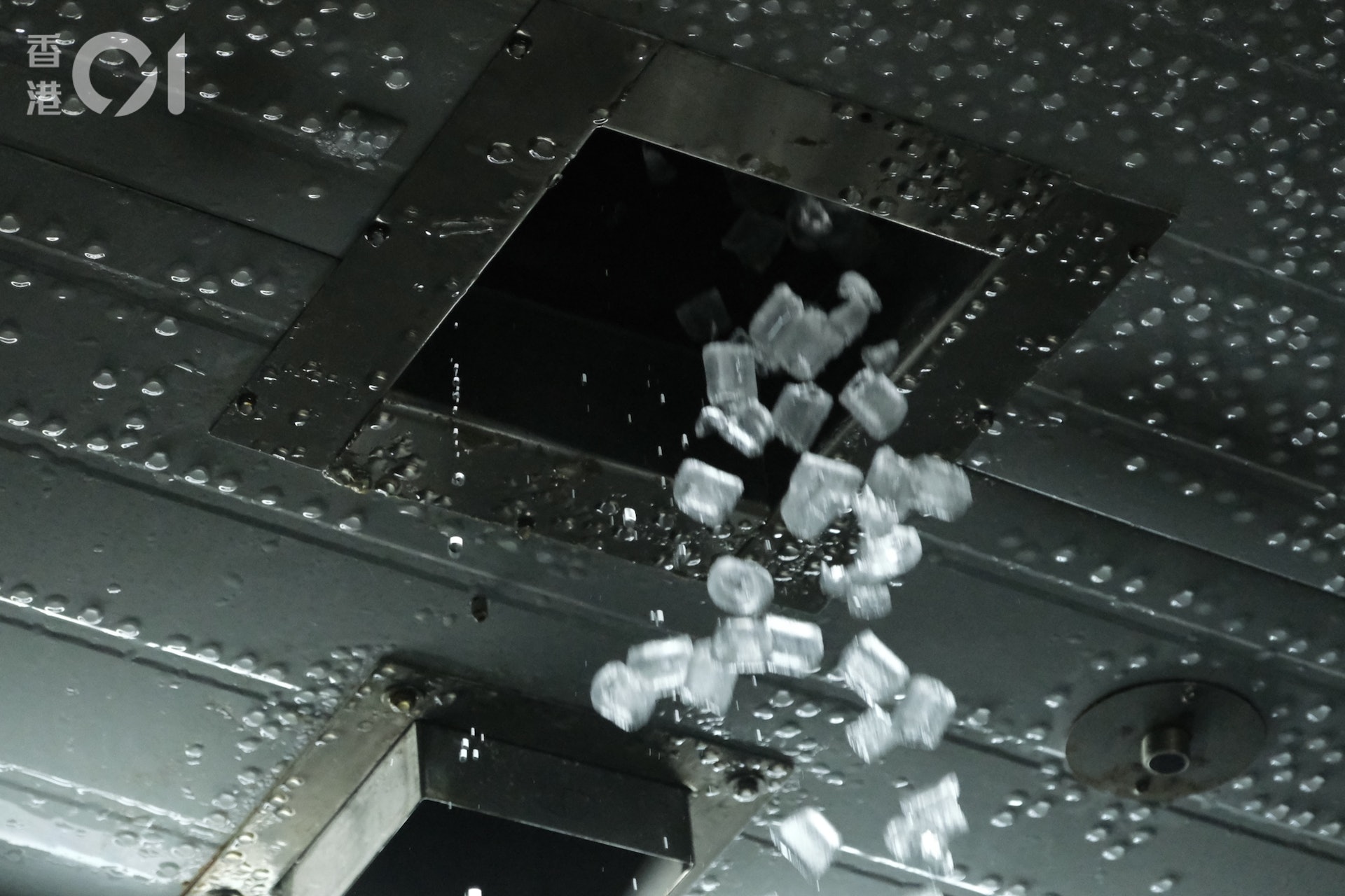2 m$ d& ^; b& {% A製好的冰粒會從冰池天花洞口掉落。(盧翊銘攝)