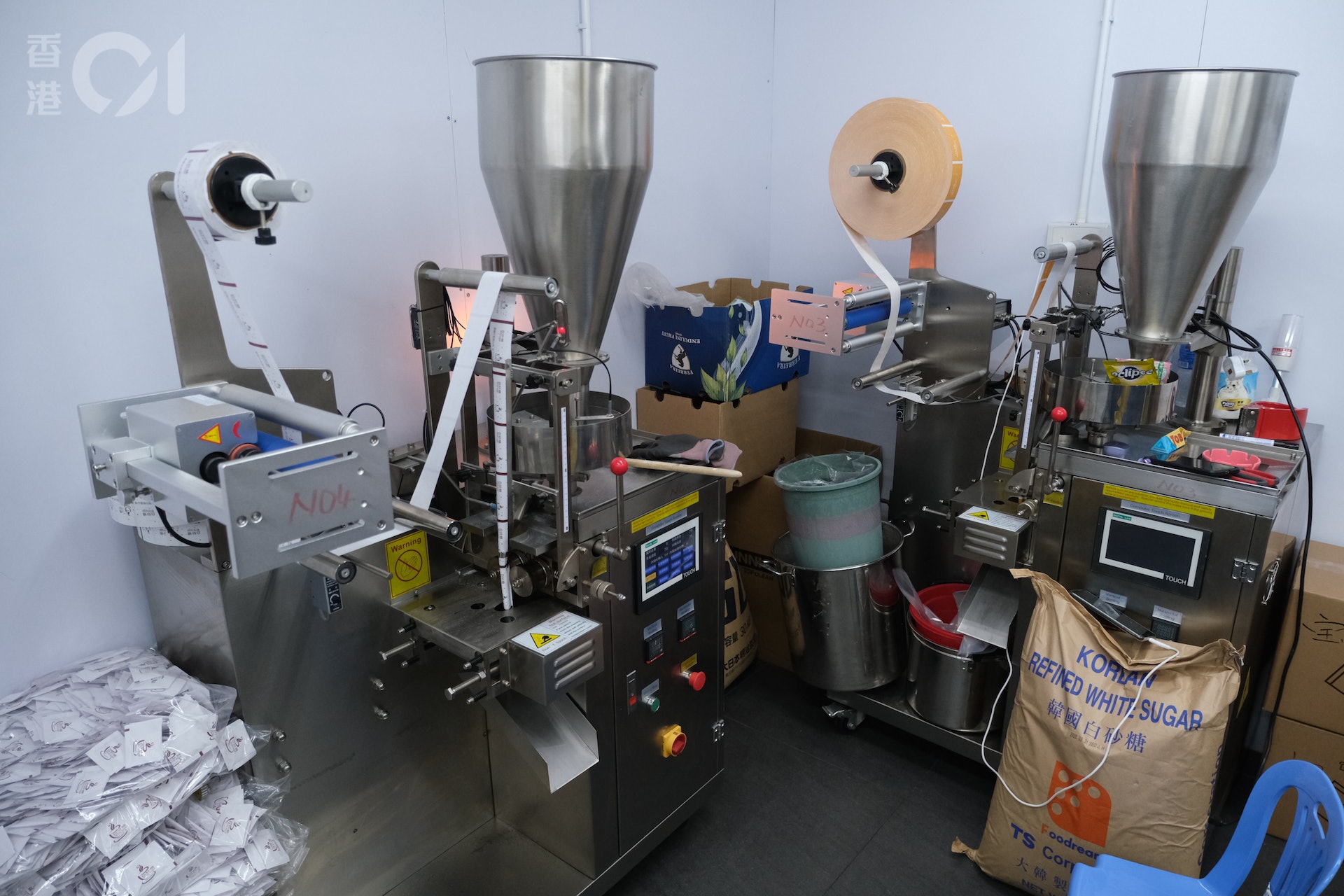7 l: b2 h. r5 ^- F$ o公仔箱論壇德保雪粒在屯門藍地的廠址佔地約5萬呎,共分開兩邊,其中一邊主要儲存及製造餐飲業供應新鮮檸檬、檸檬片、糧油雜貨及餐廳糖包等,另一邊則是製冰廠。製冰廠外放置了5個目測有兩層樓高、散熱用的大水塔,從約攝氏30度的室外氣溫進入冰廠內部,一瞬間卻有刺骨的寒意,陳衍行透露,廠內無安裝冷氣,現場的寒氣全部沿於一粒粒的冰粒。