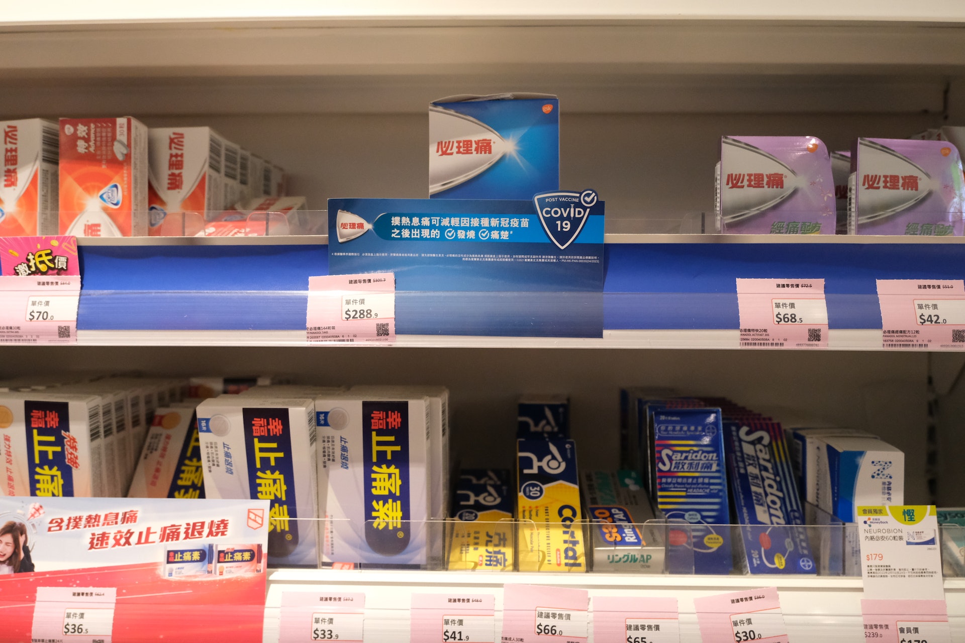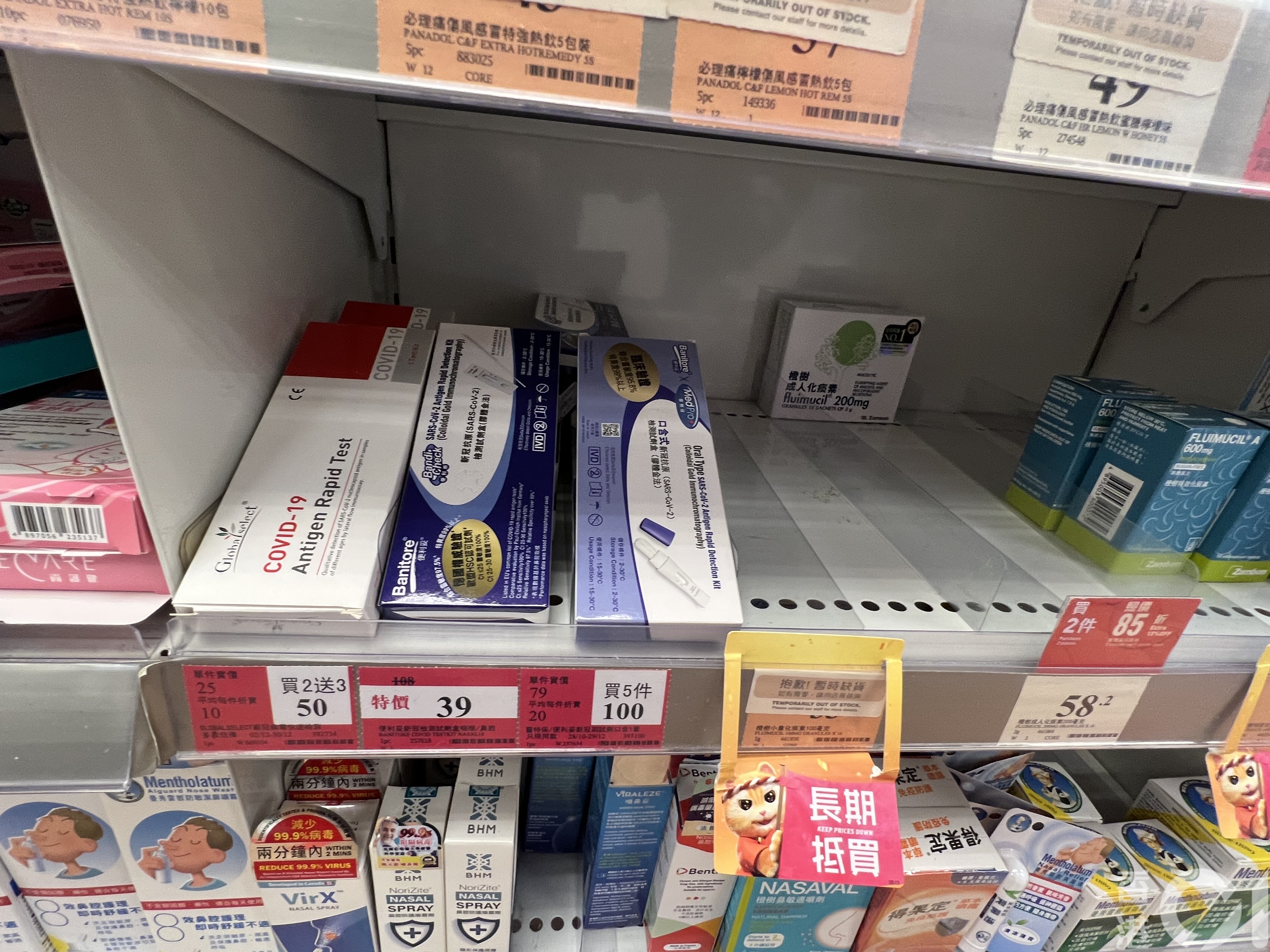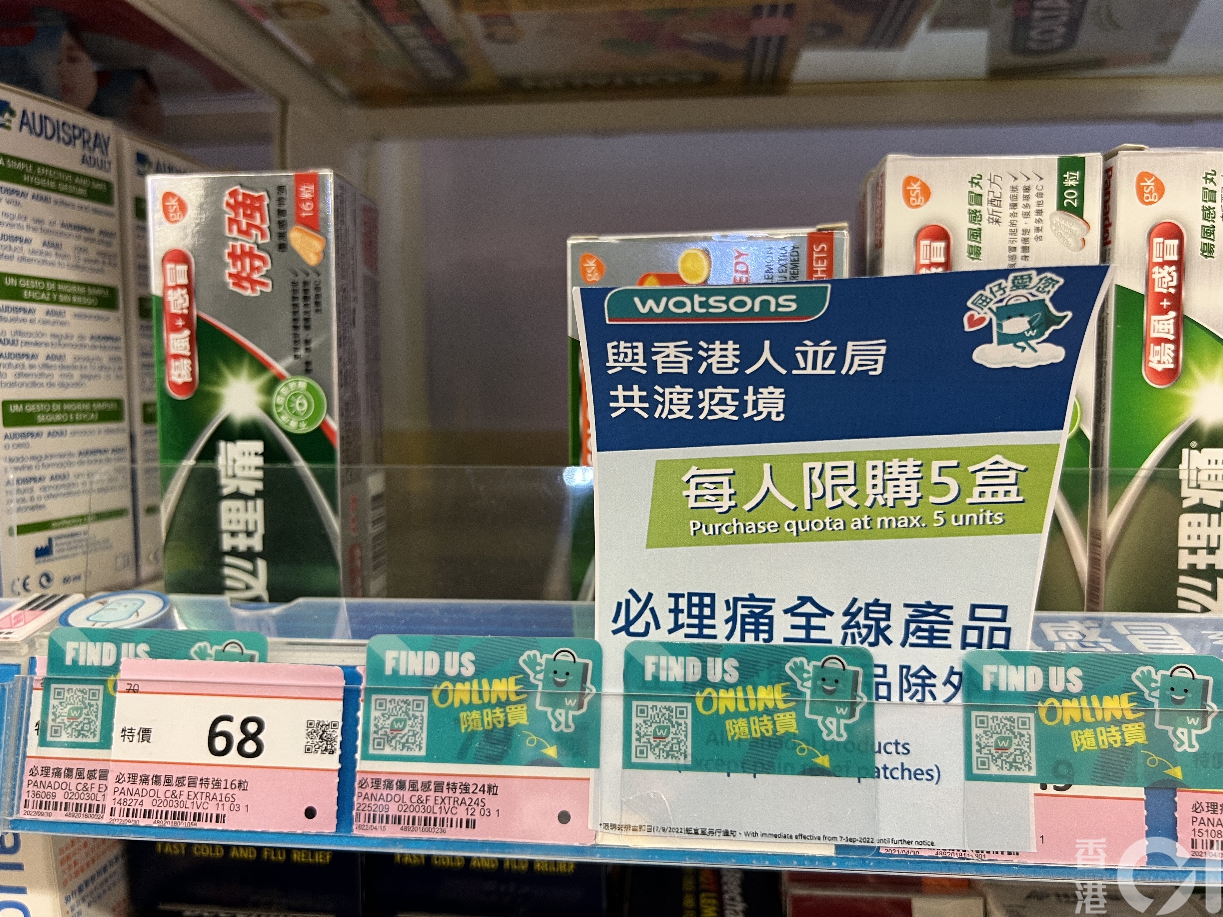 至於屈臣氏、萬寧及華潤堂等連鎖藥房,亦幾乎已「清架」,其中屈臣氏更貼出每人限購5盒的告示,有職員稱相關限制似乎今日才有,而近日掃貨顧客確有增加。萬寧特效必理痛亦幾乎掃清,連帶快測包亦可剩無幾。華潤堂也有多款必理痛缺貨,部份則只剩1至2盒。