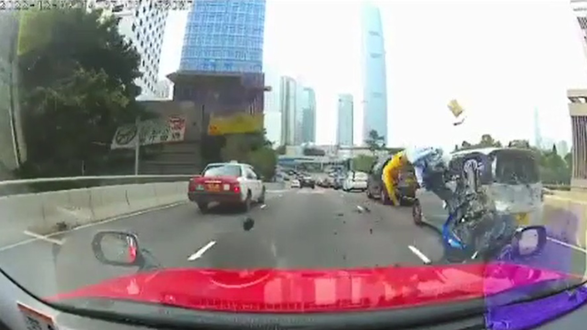 網上瘋傳一條驚險車禍的車cam影片,事發於本月3日下午2時許,一輛私家車和一輛電單車先後沿中環夏愨道快線西行,當駛至遠東金融中心對開的天橋位置時,私家車因前方有車而減速,但電單車懷疑收掣不及,猛撞私家車車尾,多個零件飛脫,餘勢未了,姓周(25歲)鐵騎士飛彈至鄰線,一輛的士駛至收掣不及,繼而將周輾過,其間車身拋起,嚇到的士司機驚呼。的士撞到周男後衝勢未止,續前行數米後始停下。周男身體多處地方受傷,頓時陷入昏迷,送院接受搶救,情況一度危殆,但經過治療後,情況轉為嚴重。